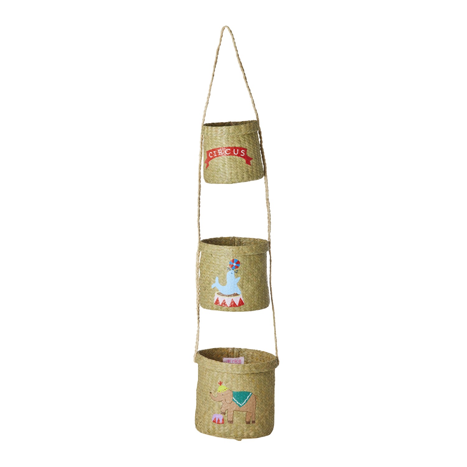 Pratico set di 3 contenitori portaoggetti in rafia natural con fantasia a tema circo ricamata a mano e cordicella intrecciata per essere appesi al muro.