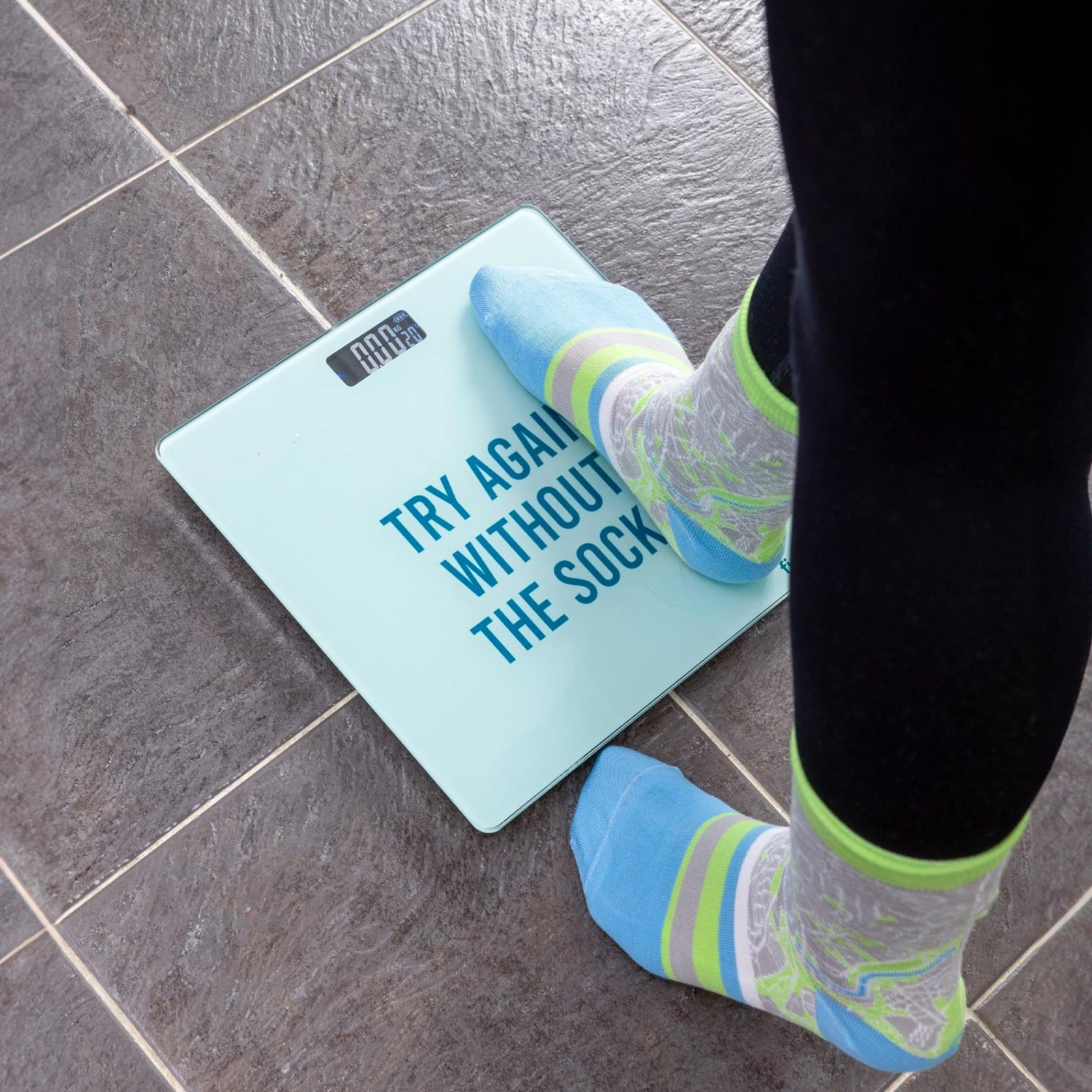 Aggiungi un tocco divertente alla tua routine quotidiana e raggiungi i tuoi obiettivi con un sorriso grazie a questa bilancia pesapersone davvero originale con la scritta "Try Again without the socks" , che ti ricorderà che quei chili in più potrebbero essere dovuti solo ai tuoi calzini. Ma non preoccuparti! Nel tuo percorso verso una vita più sana, questa bilancia ti incoraggerà a proseguire senza perdere il buon umore.