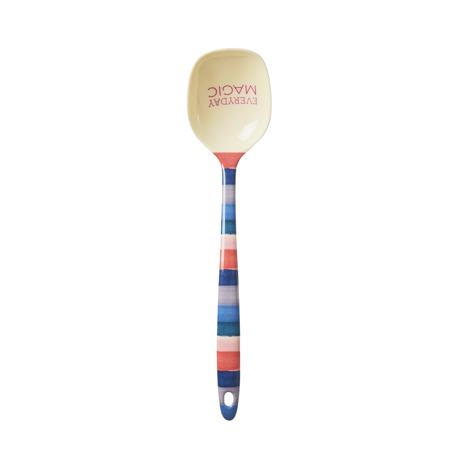 Pratico cucchiaio da cucina in melamina con manico dalla fantasia a righe multicolor e la scritta Every Magic sull'apice. Ideale come mestolo o utensile multiuso.