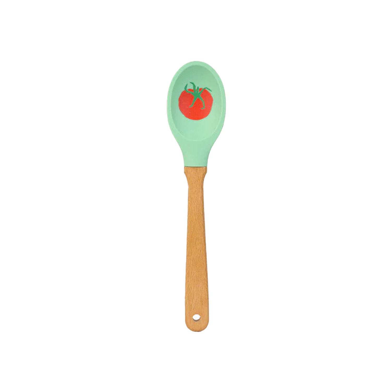 La parte in silicone, in una delicata tonalità verde pastello, è impreziosita dall'illustrazione di un pomodoro, icona della cucina mediterranea. È delicata su tutte le superfici, ideale per mescolare in pentole e padelle antiaderenti senza graffiarle.