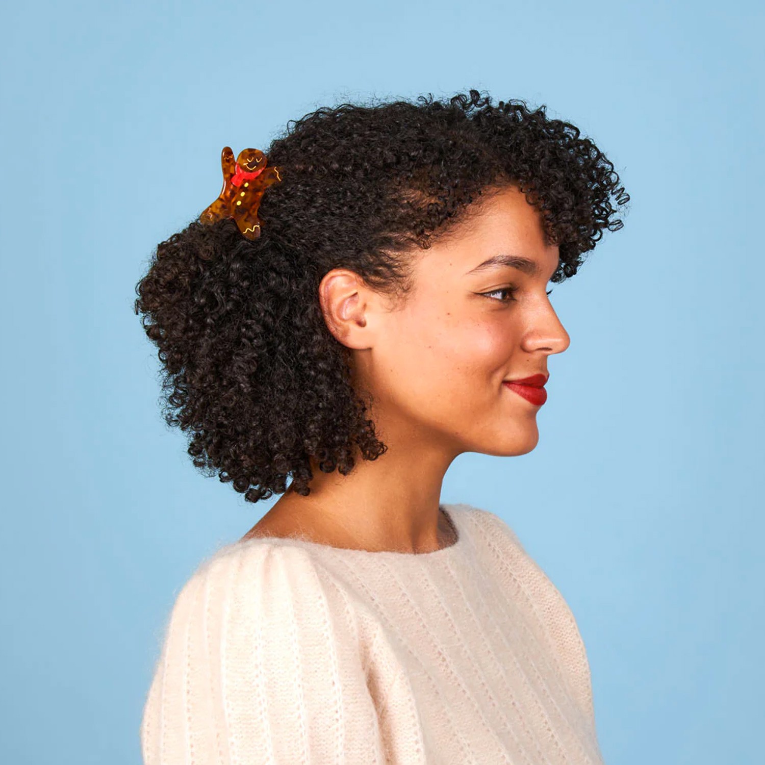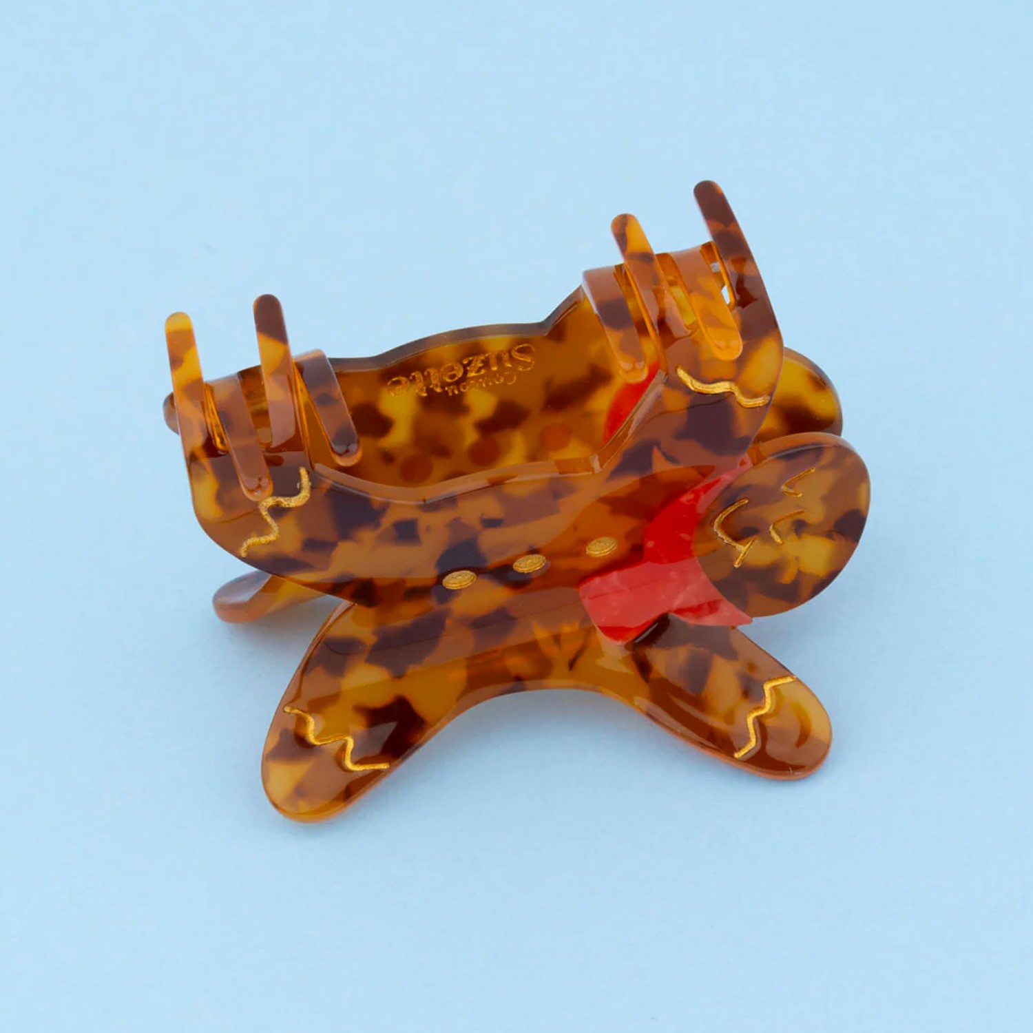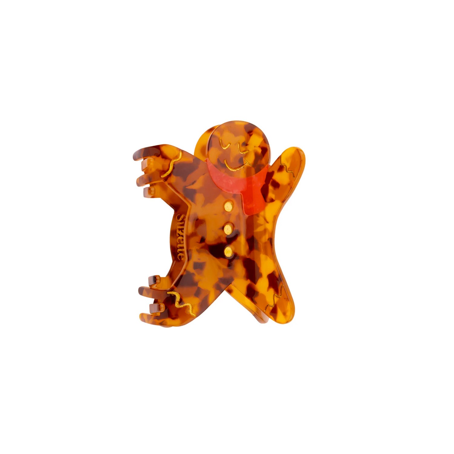 Cosa sarebbero le festività natalizie senza i gingermen appena sfornati? Celebriamo questi biscotti natalizi che quasi ci inebriano con il loro dolce profumo di cannella, con un fermaglio per capelli tartarugato abbinato a forma di simpatico omino pan di zenzero, ornato da una bellissima sciarpa rossa e dettagli dorati che lo rendono adorabile. Perfetto per acconciature festive e accoglienti per tutto l'inverno!