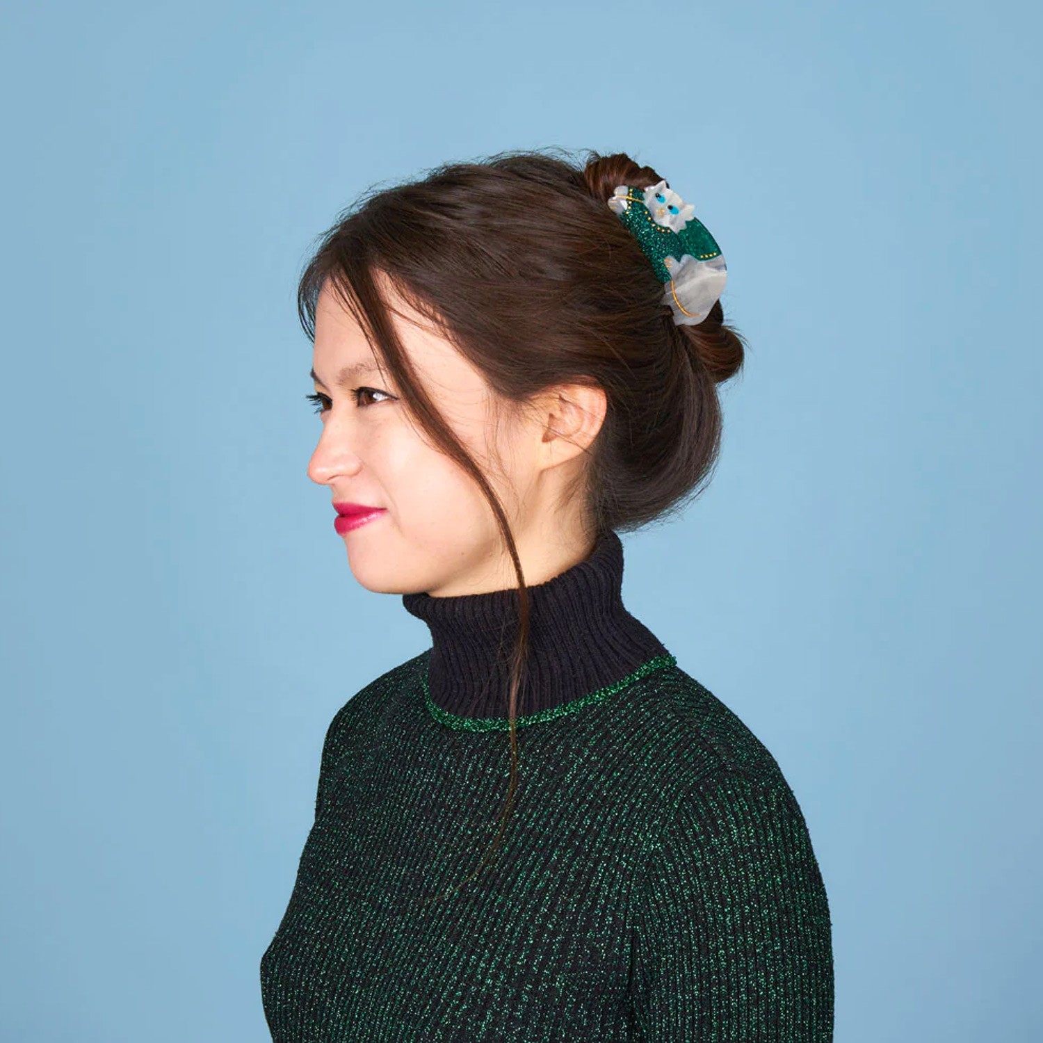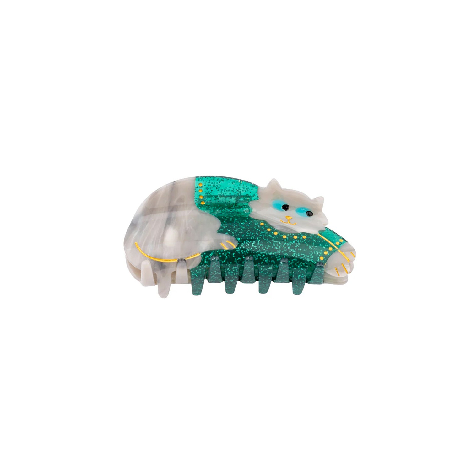Aggiungi un tocco festivo al tuo look con questo fermaglio per capelli a forma di grazioso gattino grigio in versione natalizia con maglioncino verde dai dettagli dorati, realizzato in acrilico madreperlato con denti in acetato. Così grazioso che sembra quasi una decorazione da appendere all'albero di Natale!