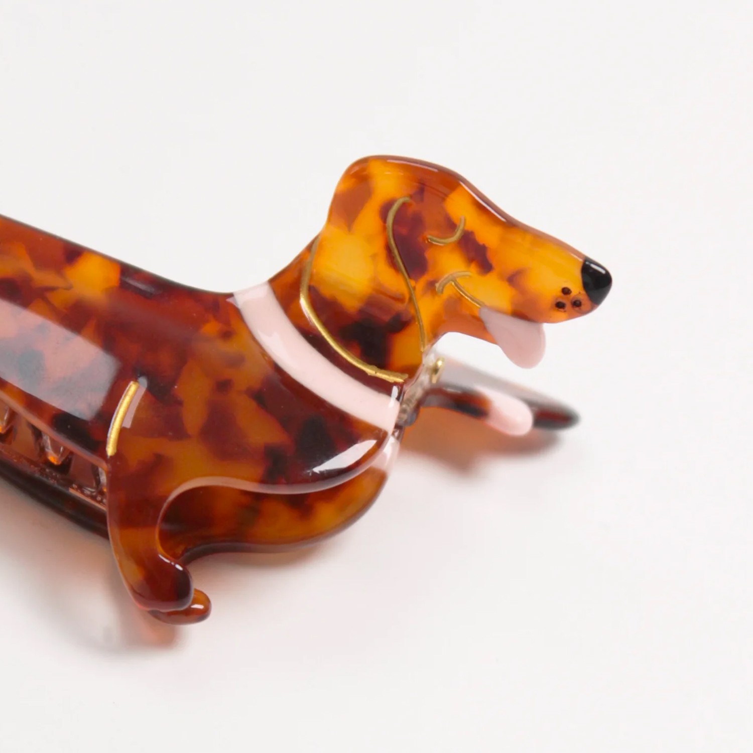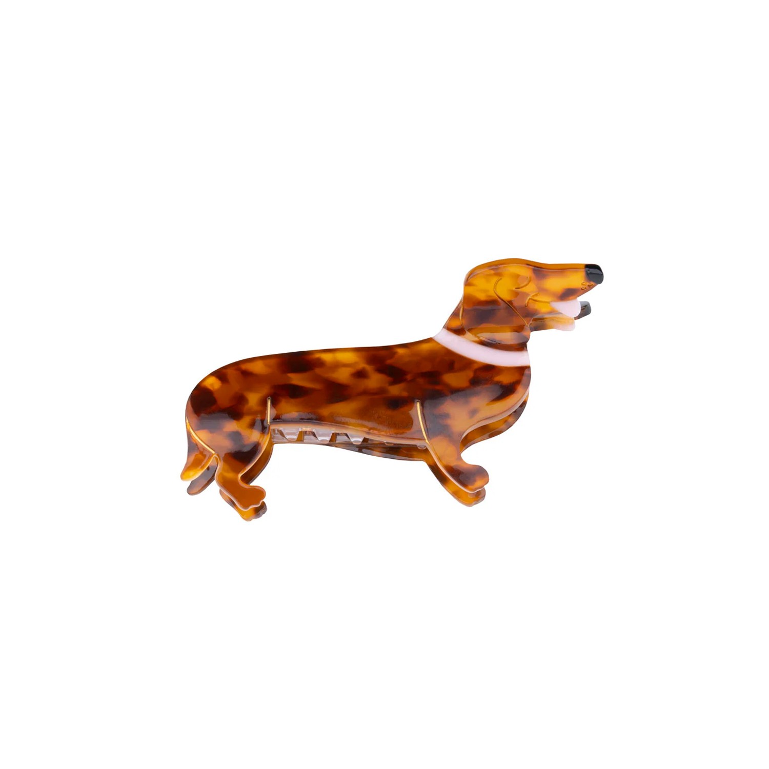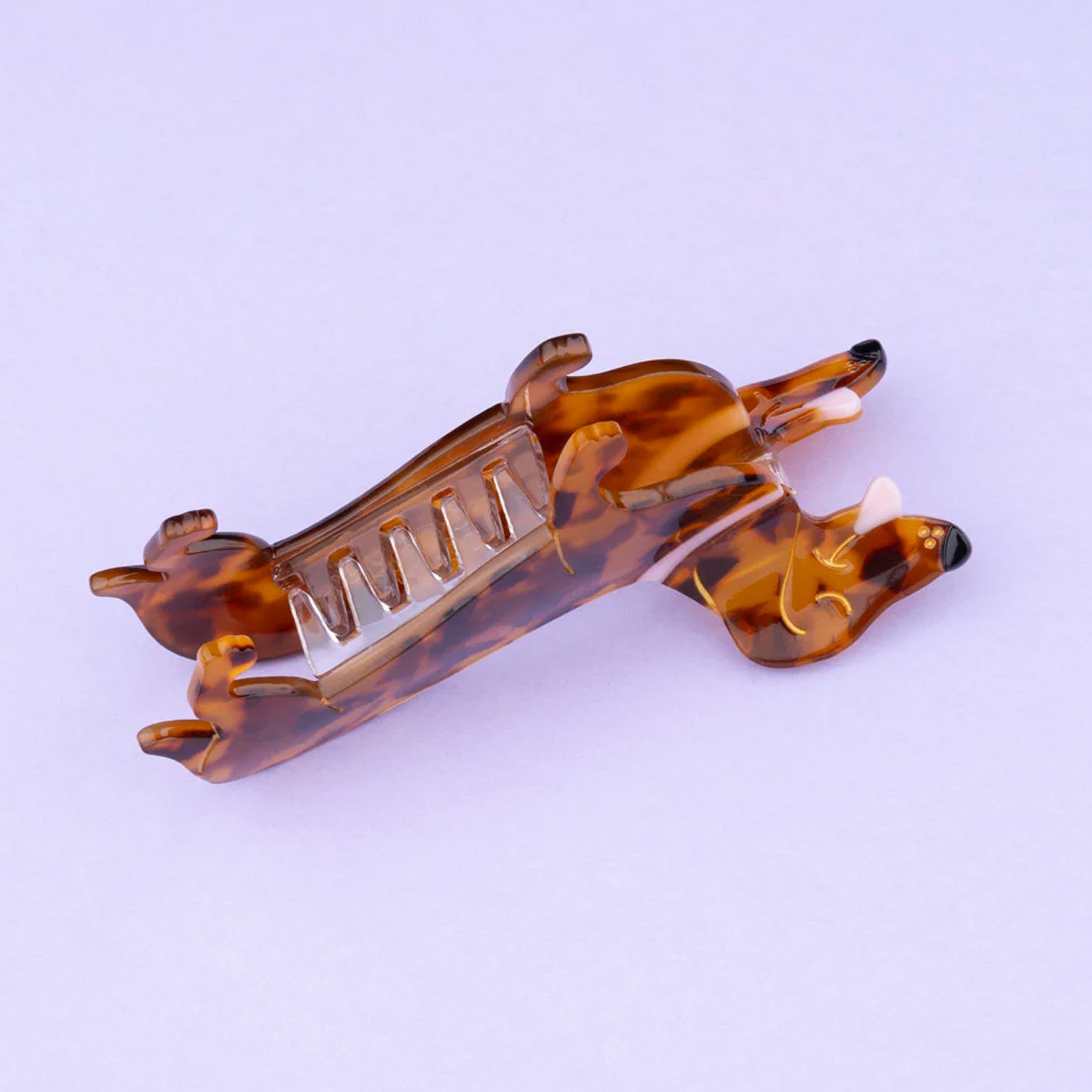Aggiungi un simpatico tocco al tuo look con questo fermaglio per capelli a forma di bassotto, realizzato in acrilico madreperlato tartarugato con denti in acetato.