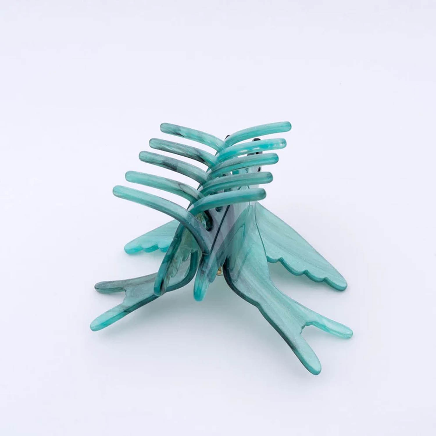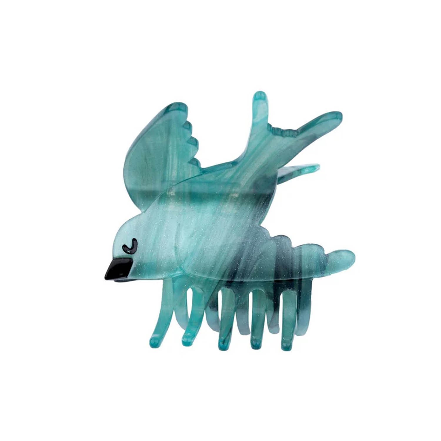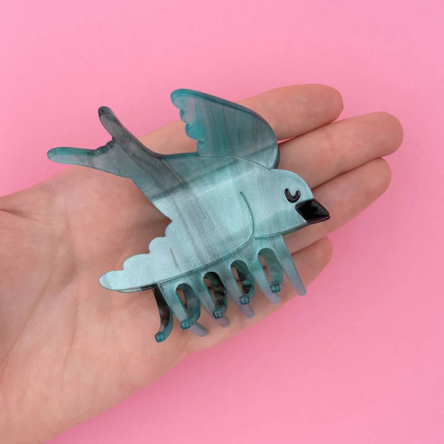 Uno splendido fermaglio per capelli a forma di rondine in volo, realizzato in acrilico di colore verde petrolio con eleganti dettagli neri e un sottile tocco di glitter. È adatta sia per capelli sottili che spessi ed è un'idea regalo davvero unica e originale, perfetta anche da inserire in un calendario dell'Avvento o per un Secret Santa. Si consiglia di evitare il contatto con l’acqua.