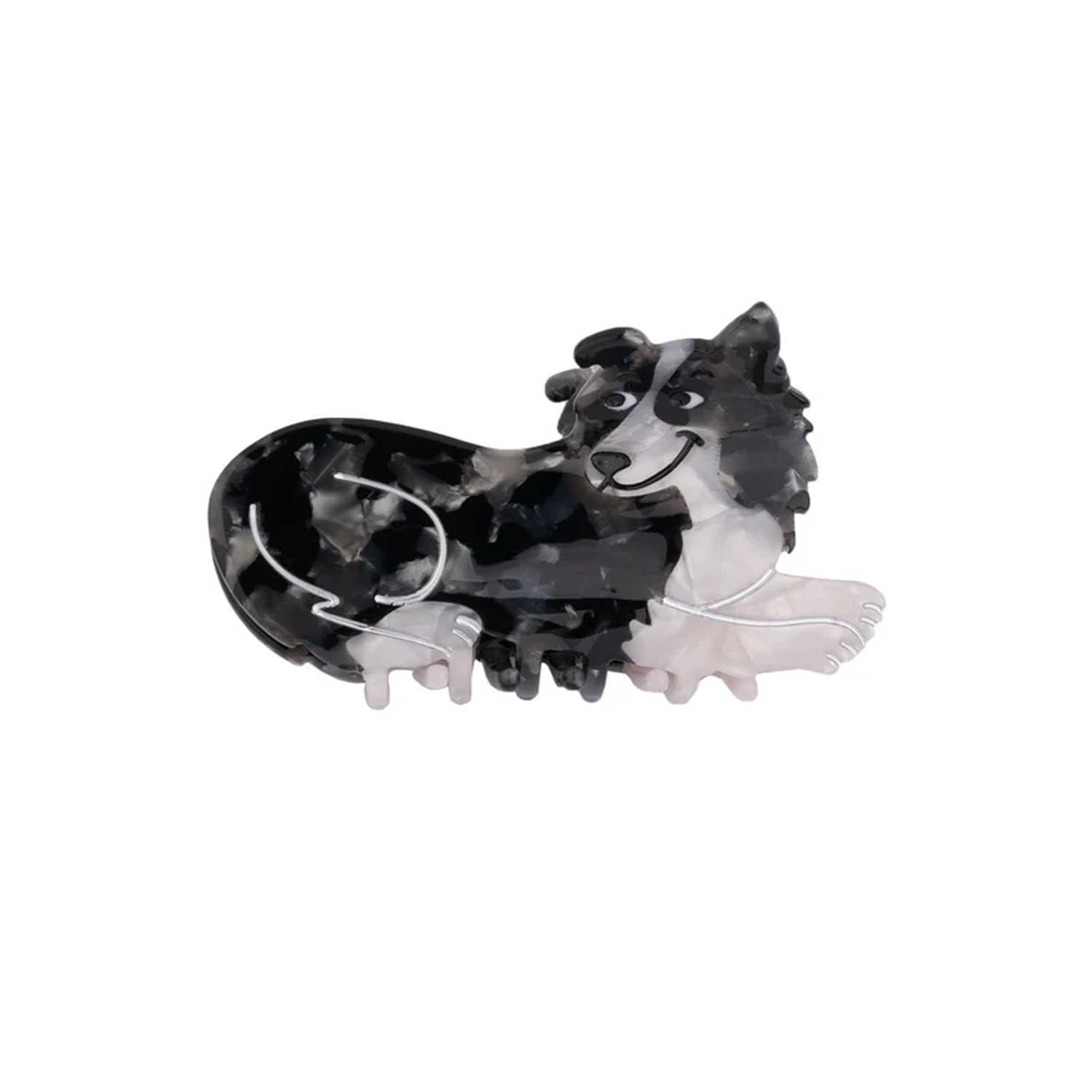 Un grazioso fermaglio per capelli con grafica in bianco e nero e denti in acetato, a forma di Border Collie, un vero e proprio omaggio a questo cane iperattivo ma elegante, con il suo lungo e setoso pelo che svolazza al vento mentre corre nella foresta! L'accessorio di cui non puoi fare a meno! Realizzato in acetato di cellulosa bianco e nero con dettagli argentati dipinti a mano, è un’idea regalo davvero unica e originale per gli amanti dei nostri amici a quattro zampe, perfetta anche da inserire in un calendario dell'Avvento o per un Secret Santa. Si consiglia di evitare il contatto con l’acqua.
