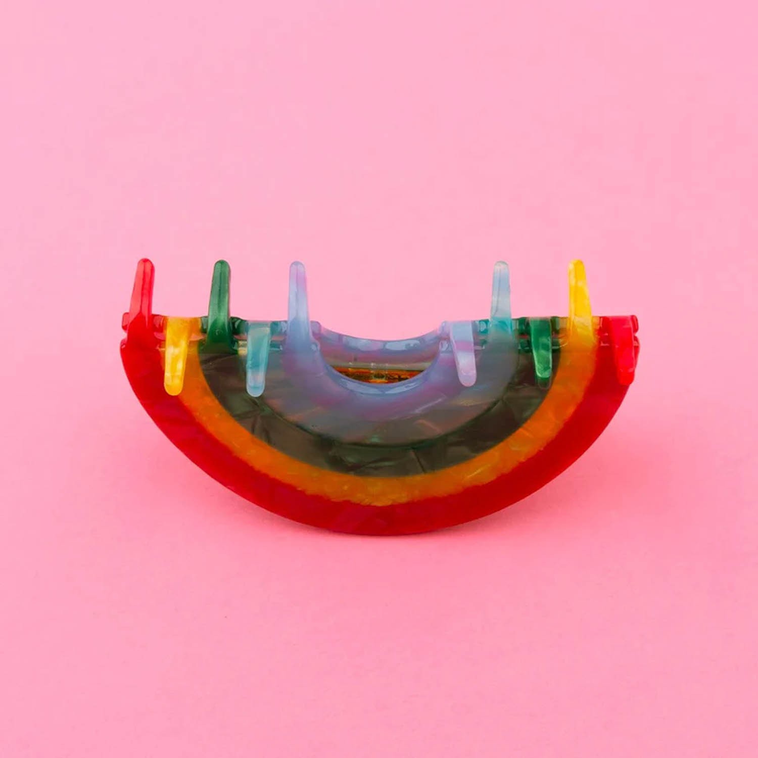Cosa c'è di meglio di un magnifico arcobaleno perlato ultra-good vibes? Non ci stanchiamo mai di ammirarli nel cielo, quindi eccolo anche tra i nostri capelli per la nostra più grande gioia. Un fermaglio per capelli a forma di arcobaleno per acconciature sempre più originali. Realizzato da Coucou Suzette in acrilico madreperlato con denti in metallo, è un’idea regalo davvero unica e originale, perfetta anche da inserire in un calendario dell'Avvento o per un Secret Santa. Si consiglia di evitare il contatto con l’acqua.
