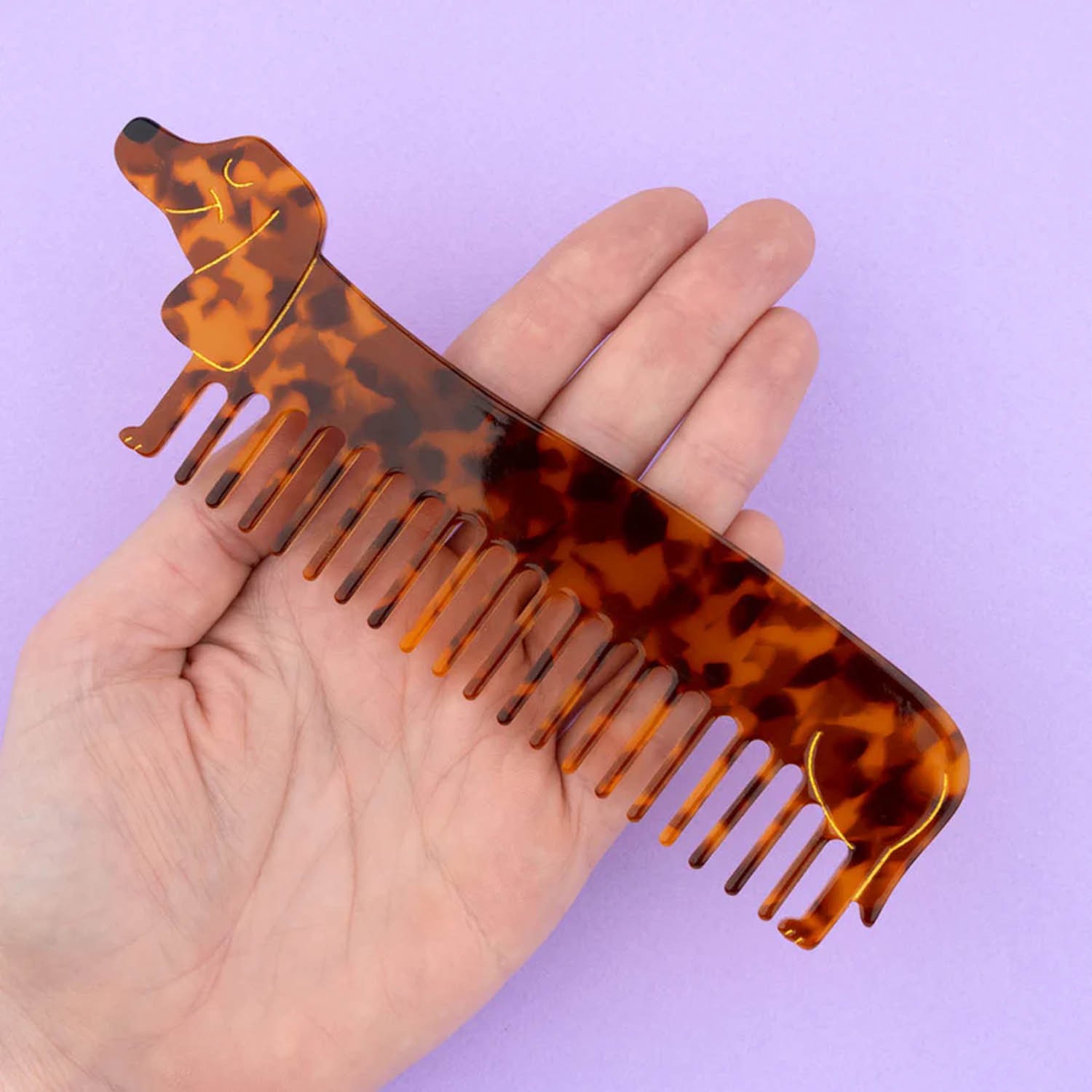 Il nostro amato cane è tornato in una forma completamente nuova, questa volta con denti in acetato per un pettine unico nel suo genere! Ideale sia per i capelli lunghi che corti, questo piccolo bassotto diventerà sicuramente un punto fermo della nostra routine mattutina. Realizzato in acetato di cellulosa tartarugato con dettagli dorati dipinti a mano, è un’idea regalo davvero unica e originale per gli amanti dei nostri amici a quattro zampe, perfetta anche da inserire in un calendario dell'Avvento o per un Secret Santa. Si consiglia di evitare il contatto con l’acqua.