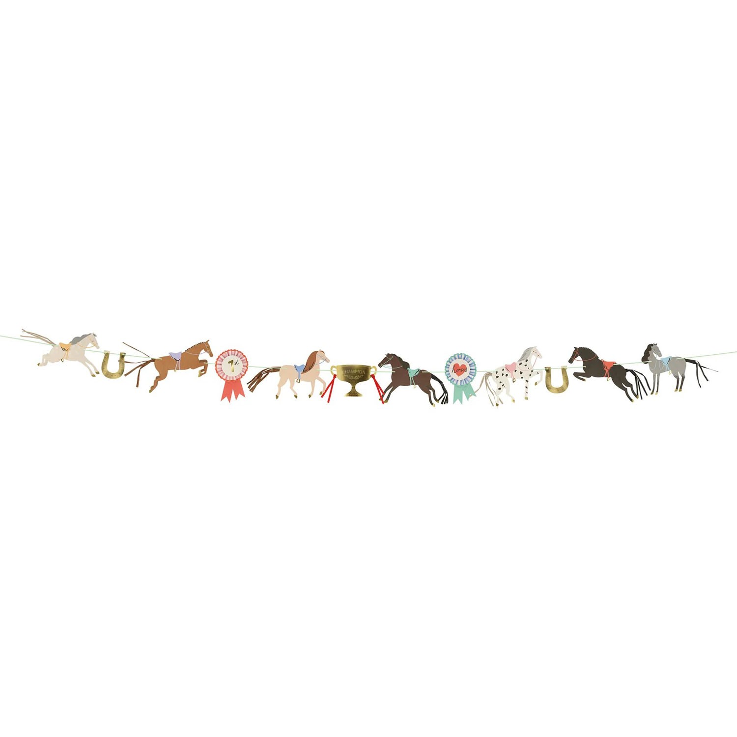 Questo festone di compleanno farà galoppare di gioia i tuoi ospiti! La combinazione di cavalli, ferri di cavallo in lamina lucida, coppe dei campioni e coccarde colorate sarà perfetta sulla tavola della festa o sulla parete. È anche una meravigliosa decorazione per la cameretta dei più piccini amanti dei cavalli.