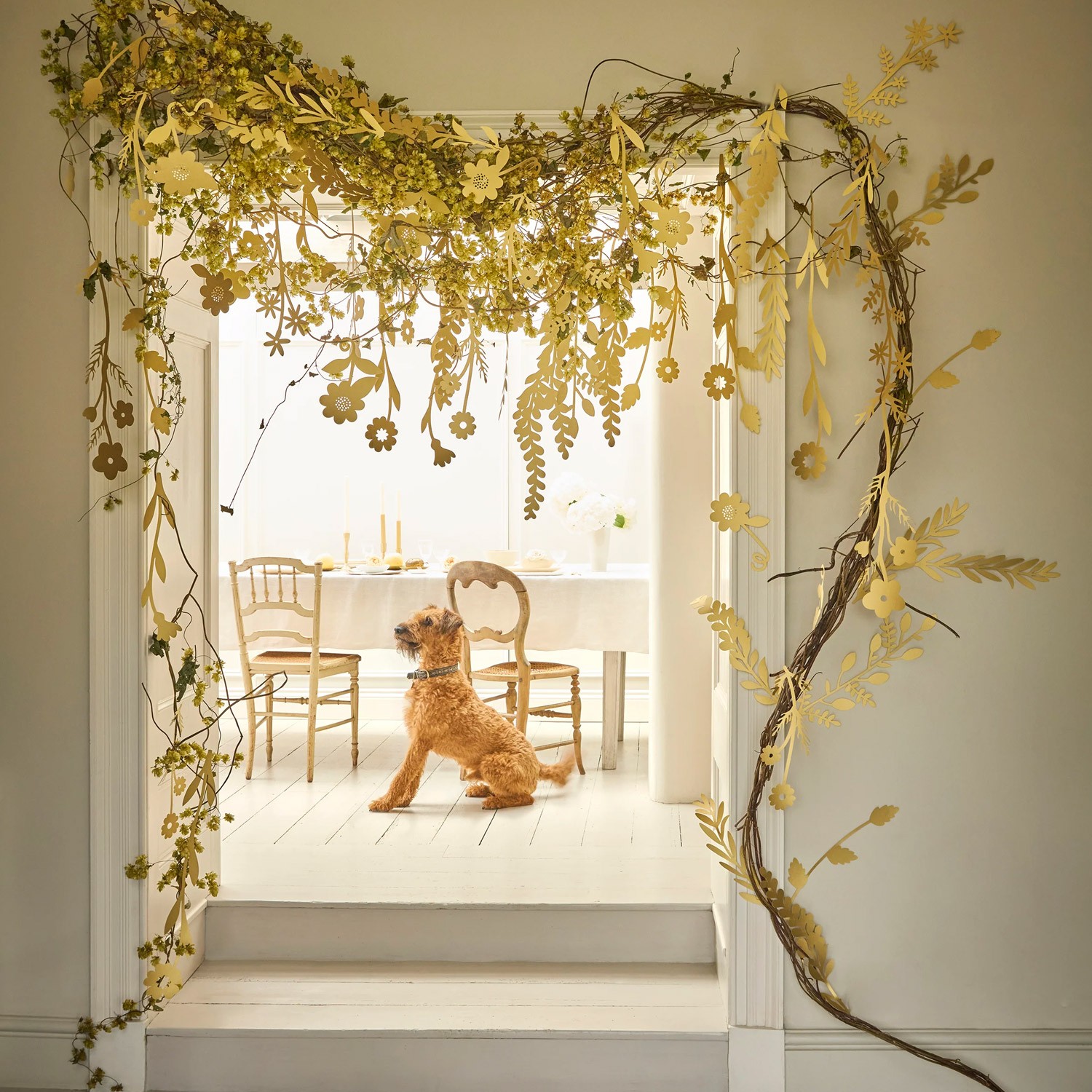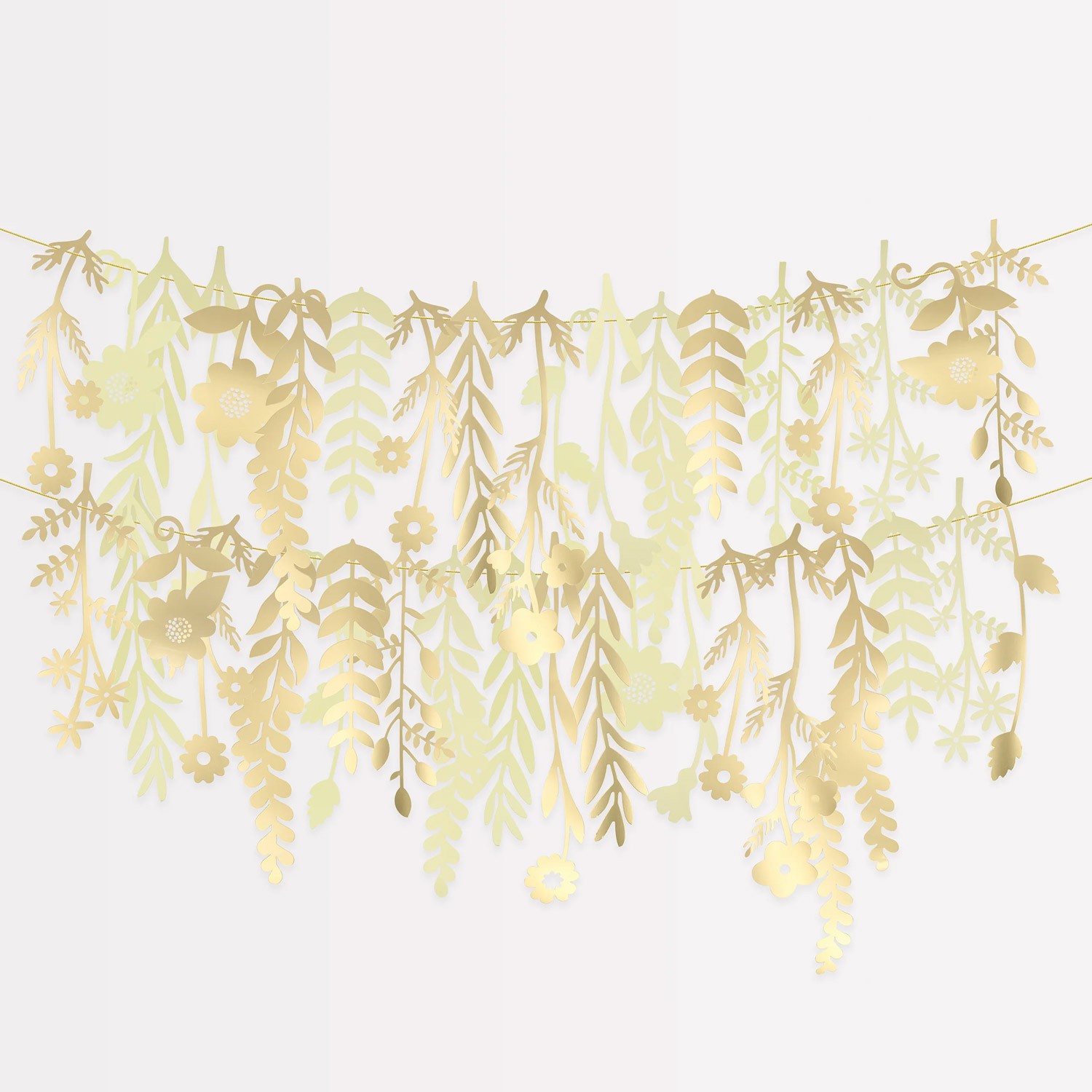 Nella confezione troverai 2 cordine dorate metalliche e 40 diversi pezzi di fiori e fogliame, realizzati in carta di alta qualità con un effetto in lamina dorata opaca su un lato e una stampa neutra sull'altro.