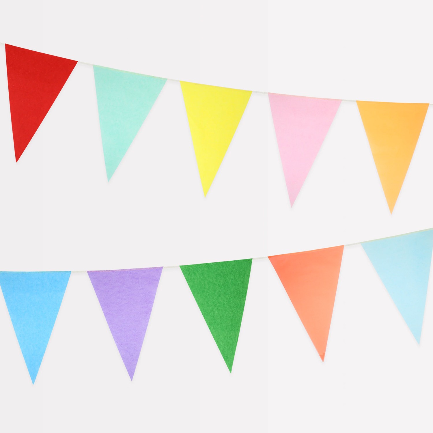 Sventola le bandierine, c'è un evento speciale da festeggiare! Queste ghirlande di bandierine di carta velina luminose e colorate sono ideali da appendere sui tavoli delle feste, sui caminetti o sulle porte, in veranda, alle finestre o in giardino. Il mix di colori si adatterà magnificamente a qualsiasi tema di festa. Riutilizzale più e più volte per una svagonata di allegria ogni volta!