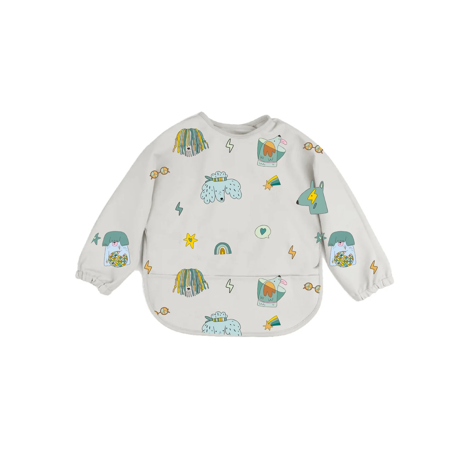Questo bavaglino impermeabile dotato di pratiche e lunghe maniche, con simpatica fantasia a tema cagnolini funky disegnata sopra, offre una protezione ottimale contro macchie, umidità e odori ed è la scelta perfetta per i genitori che cercano una soluzione semplice ed efficace per i pasti dei loro bambini. Realizzato in poliestere Oeko-Tex riciclato al 100%, non è solo ecologico ma anche particolarmente facile da pulire. Il bavaglino è ideale per mangiare, fare lavoretti o progetti creativi a casa o all'asilo.