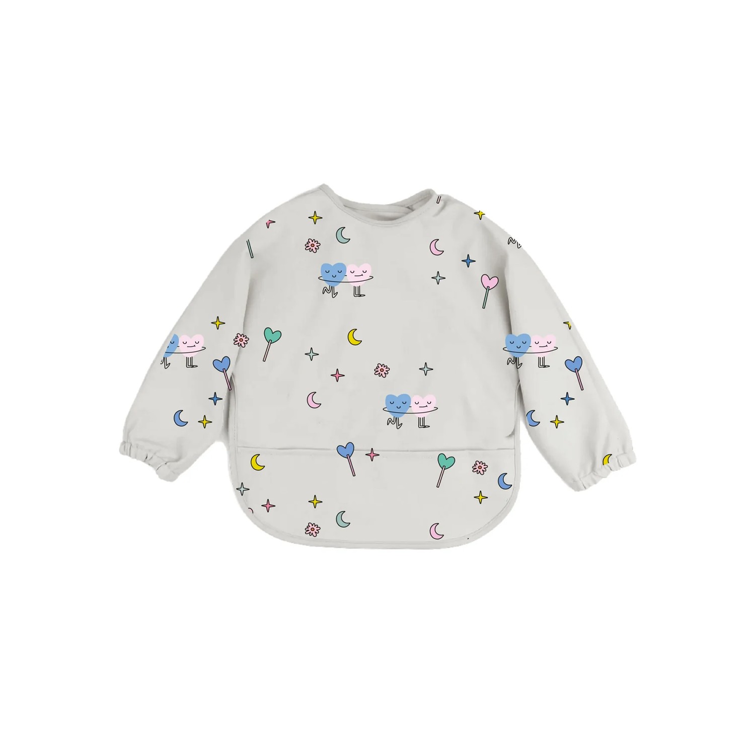 Questo bavaglino impermeabile dotato di pratiche e lunghe maniche, con graziosa fantasia a tema cuoricini danzanti disegnata sopra, offre una protezione ottimale contro macchie, umidità e odori ed è la scelta perfetta per i genitori che cercano una soluzione semplice ed efficace per i pasti dei loro bambini. Realizzato in poliestere Oeko-Tex riciclato al 100%, non è solo ecologico ma anche particolarmente facile da pulire. Il bavaglino è ideale per mangiare, fare lavoretti o progetti creativi a casa o all'asilo.