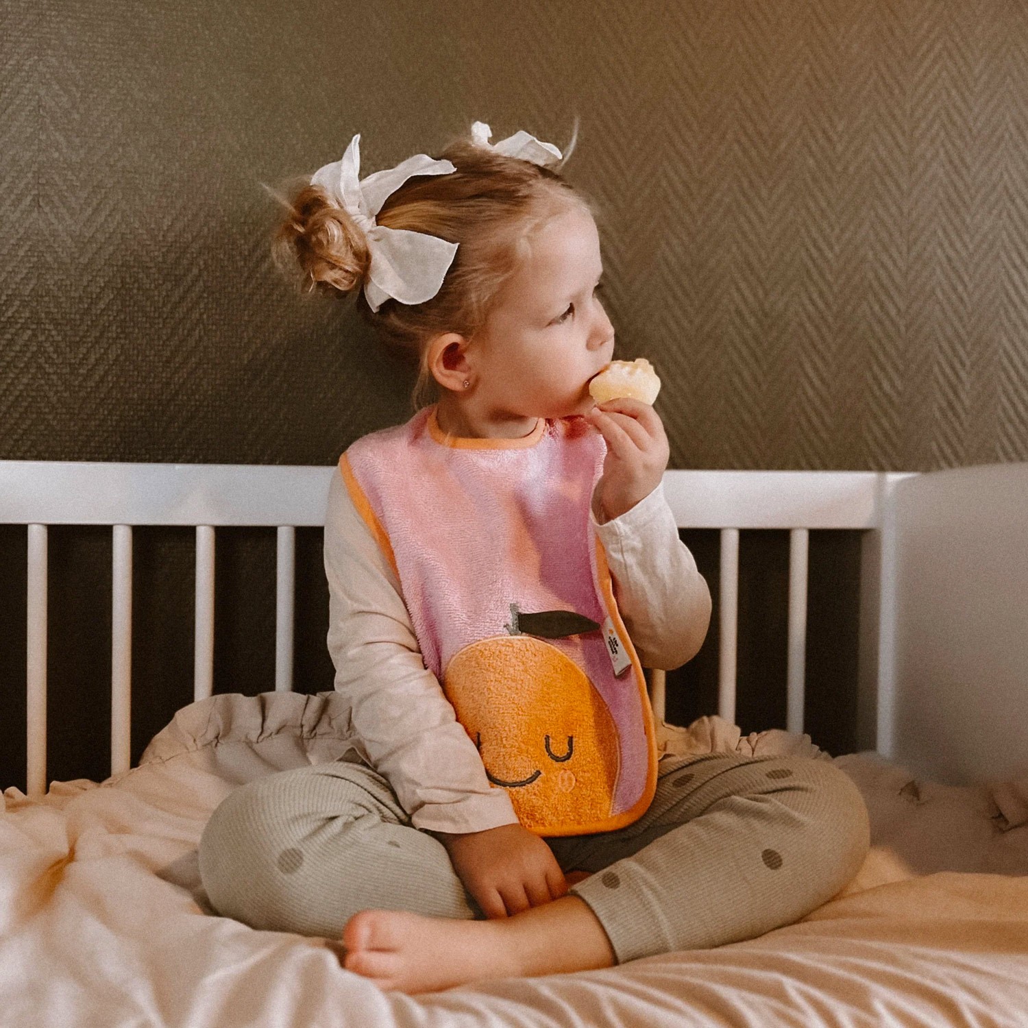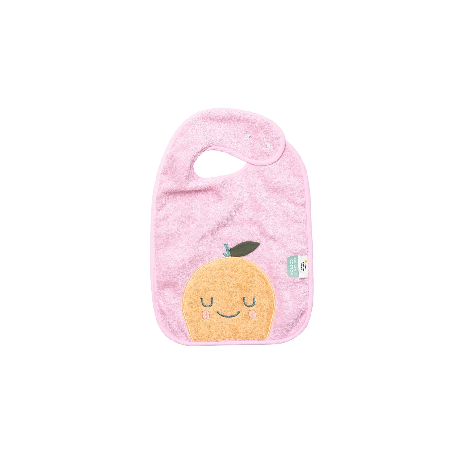Rendi i pasti dei più piccoli facili e divertenti con il bavaglino in spugna! Ispirato alla frutta e ricamato con un simpatico mandarino sorridente, è realizzato in morbido cotone spugnoso rosa di alta qualità e offre una vestibilità regolabile grazie alla pratica chiusura in velcro.
