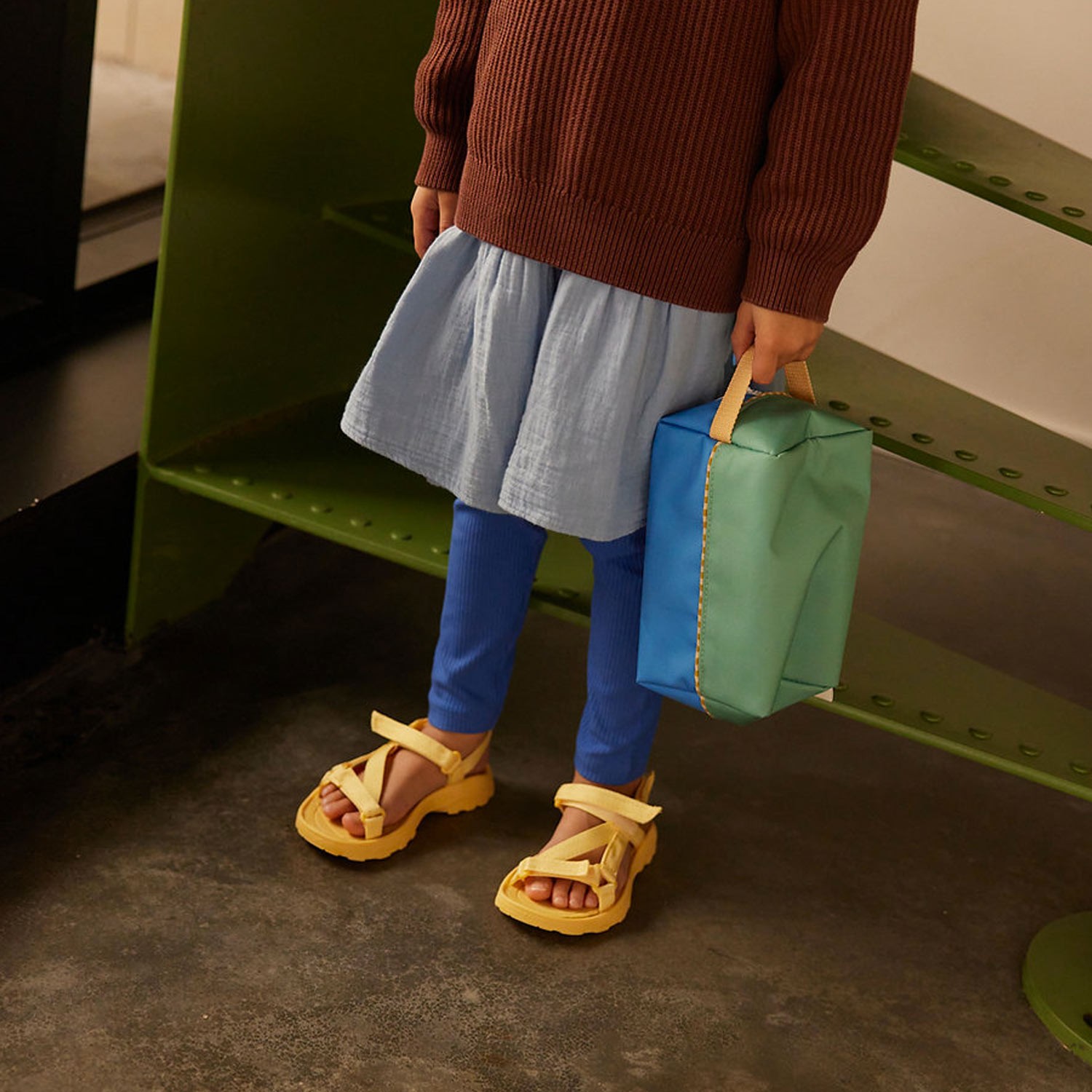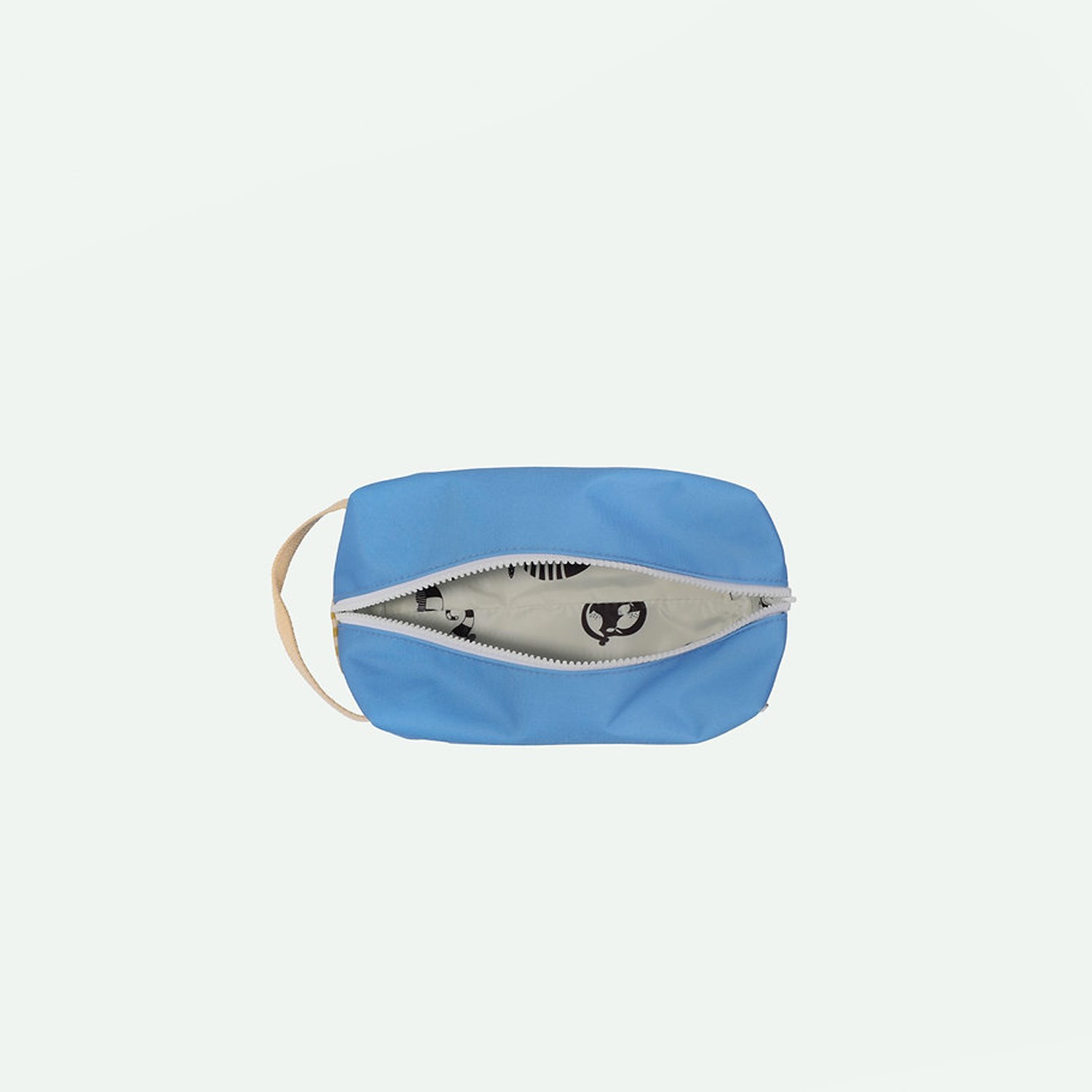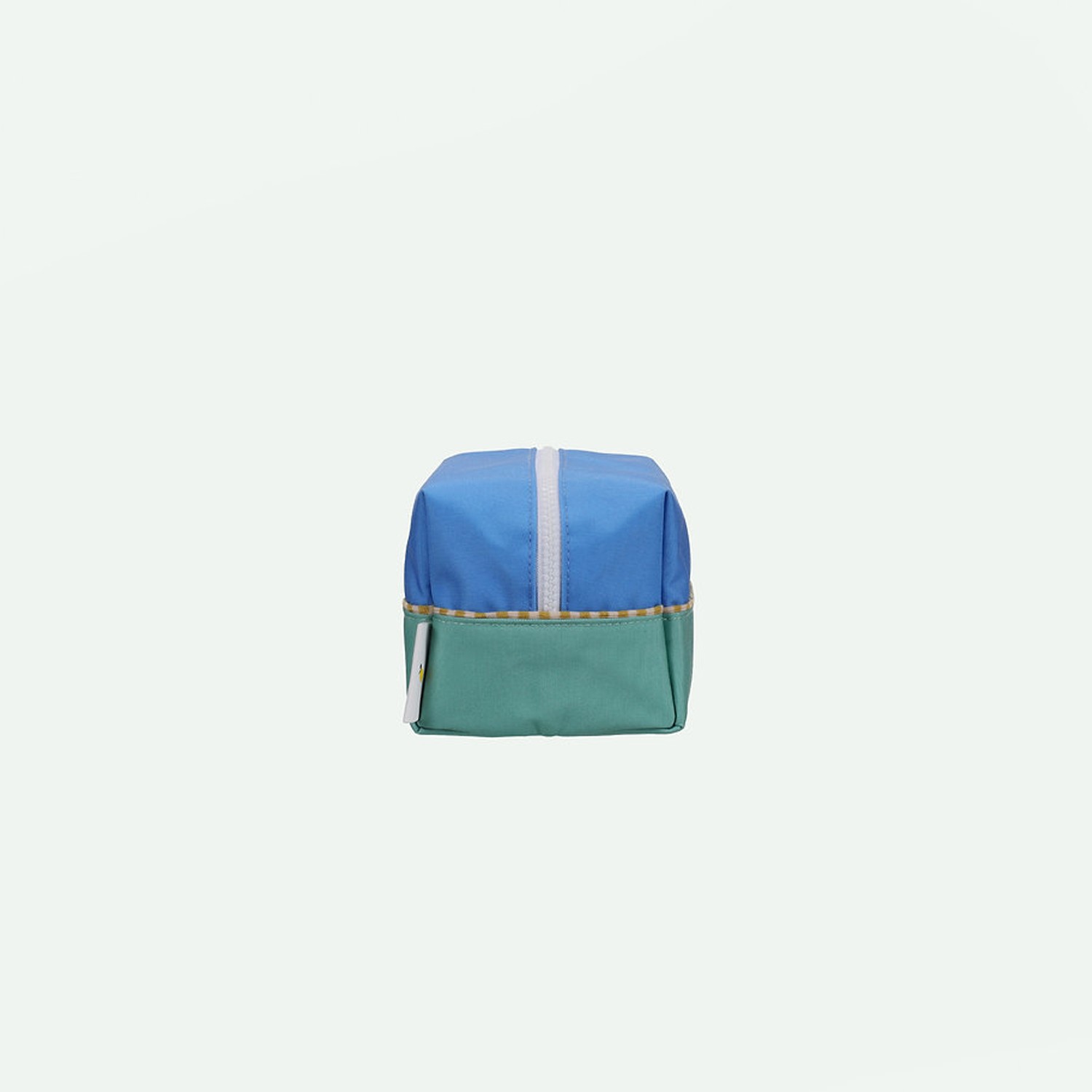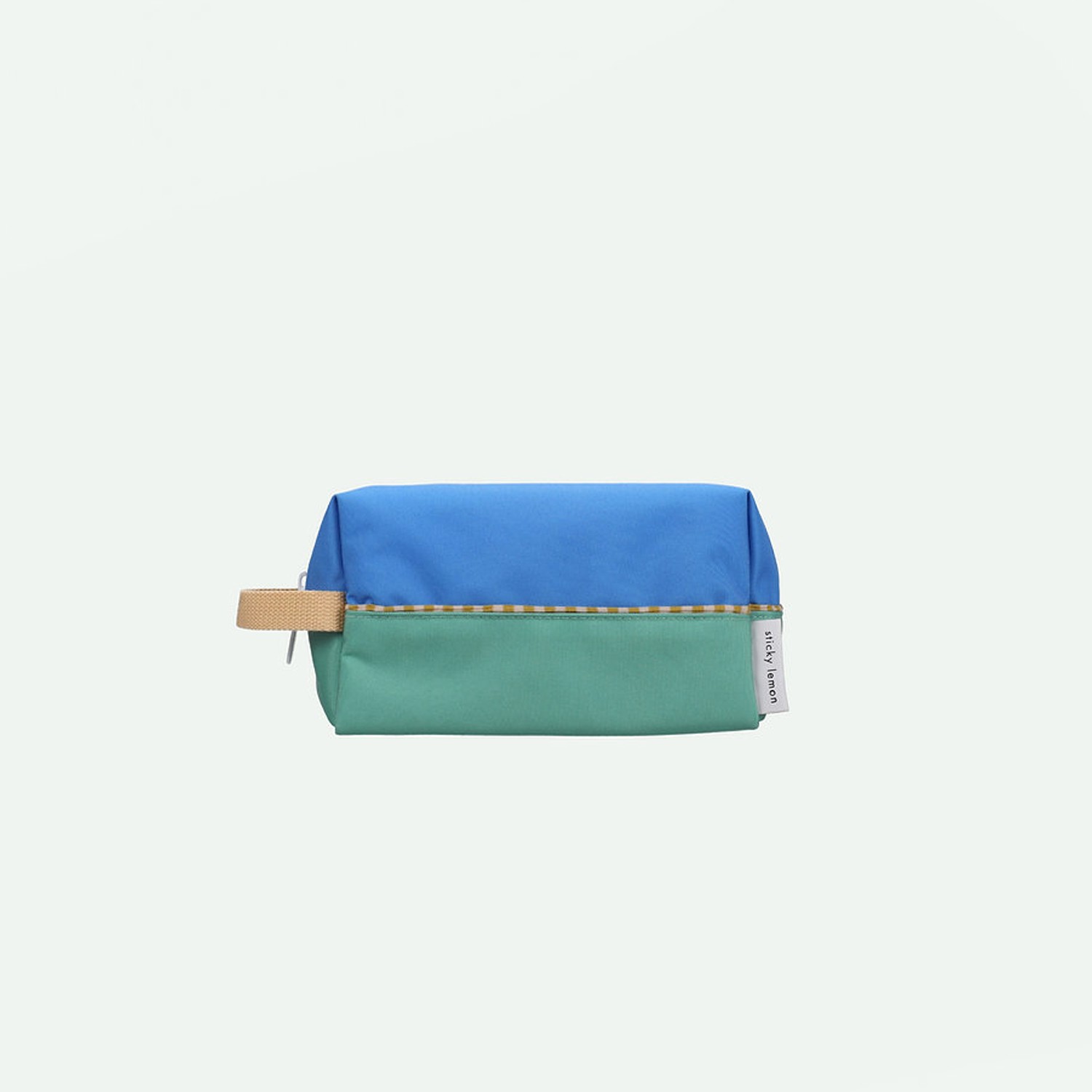 Astuccio grande bicolor azzurro cielo e verde acqua realizzato con bottiglie riciclate e perfetto come contenitore dei prodotti per la cura del tuo corpo, ma ideale anche come astuccio per la scuola dei più piccoli. L'interno ha una fodera impermeabile con motivo marino disegnato a mano, mentre il cinturino laterale beige lo rende molto facile e pratico da trasportare in giro. Dotato di chiusura con cerniera YKK.