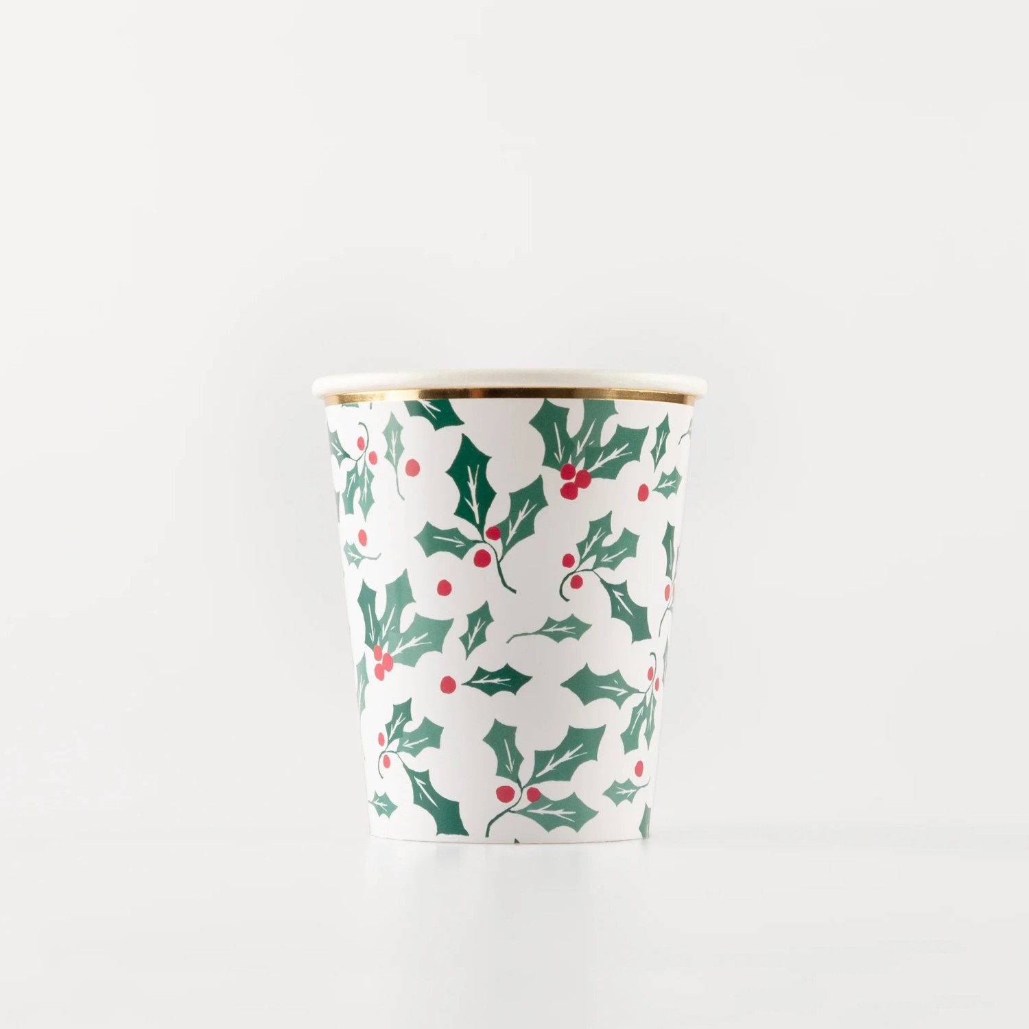 Grazioso bicchiere natalizio decorato con disegni di agrifogli e bordo dorato. Rendi ancor più speciale la tua tavola scegliendo anche il piatto e il tovagliolo coordinato. Confezione da 8.