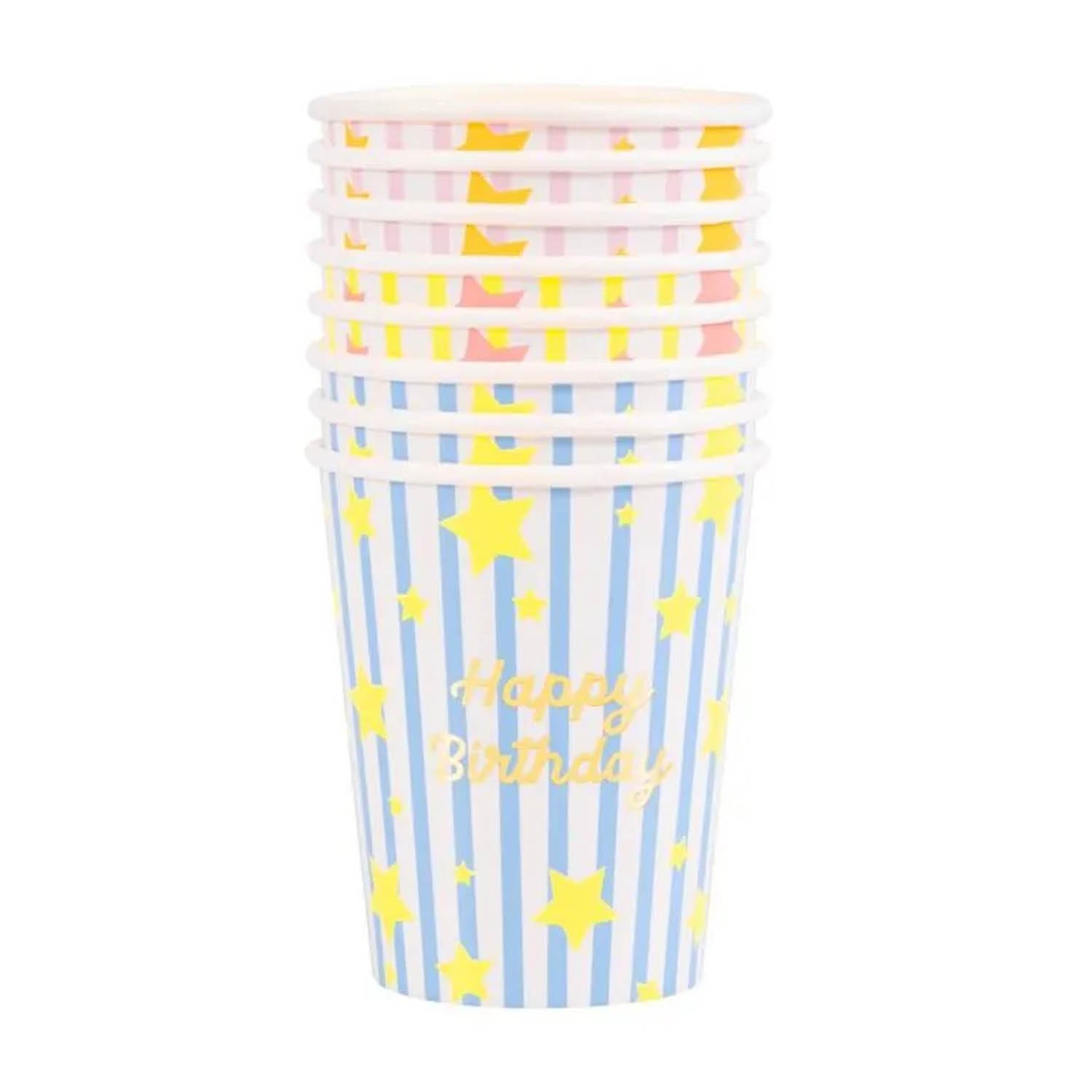 Festeggia il protagonista della festa con questi esclusivi bicchieri di carta a forma di stella. Al centro di ogni pezzo spicca l'augurio "Buon compleanno" in oro lucente, incorniciato da vivaci strisce gialle, rosa o blu. Il tocco finale? Piccole stelle neon che accendono l'atmosfera di pura allegria. Progettati per servire con stile sia bevande calde che fredde, sono l'accessorio perfetto da abbinare alla nostra linea coordinata per un party davvero stellare. Questi bicchieri di carta sono adatti per bevande calde e fredde, pratici e decorativi. Ogni set da 8 include 3 bicchieri a righe rosa, 2 bicchieri a righe gialle e 3 bicchieri a righe blu, con stelle al neon arancioni, rosa e gialle. Scritta "Buon Compleanno" in lettere dorate lucide.