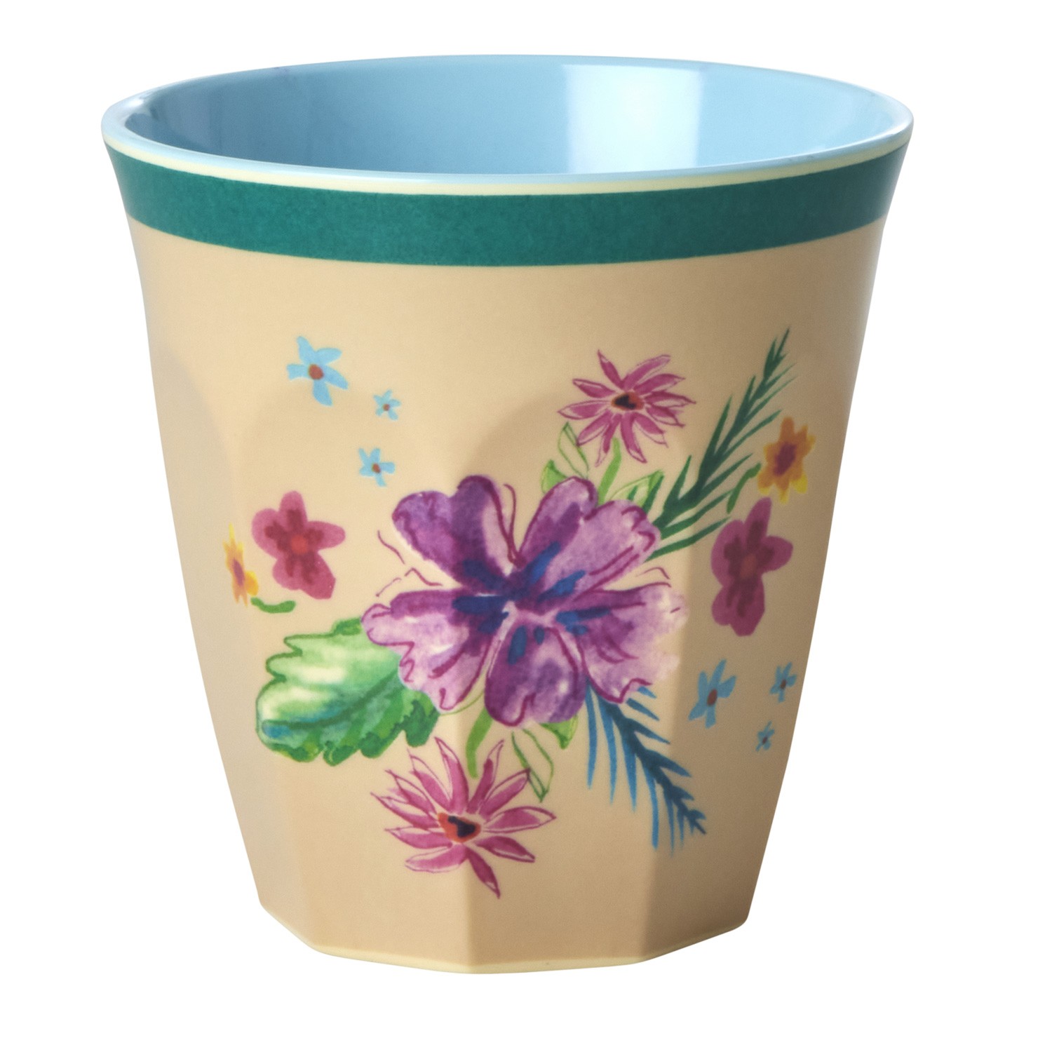 Bicchiere medio in melamina con interno in tinta unita azzurra ed esterno color crema decorato con graziosa fantasia floreale e bordo verde smeraldo. Perfetto per dare il giusto tocco di colore alla tua tavola di prima mattina con l’estate dentro! Abbinalo ai nostri piatti e tazze a tema! Usalo per qualsiasi cosa, anche come porta matite o come vasetto porta fiori, o semplicemente per un piacevole picnic.