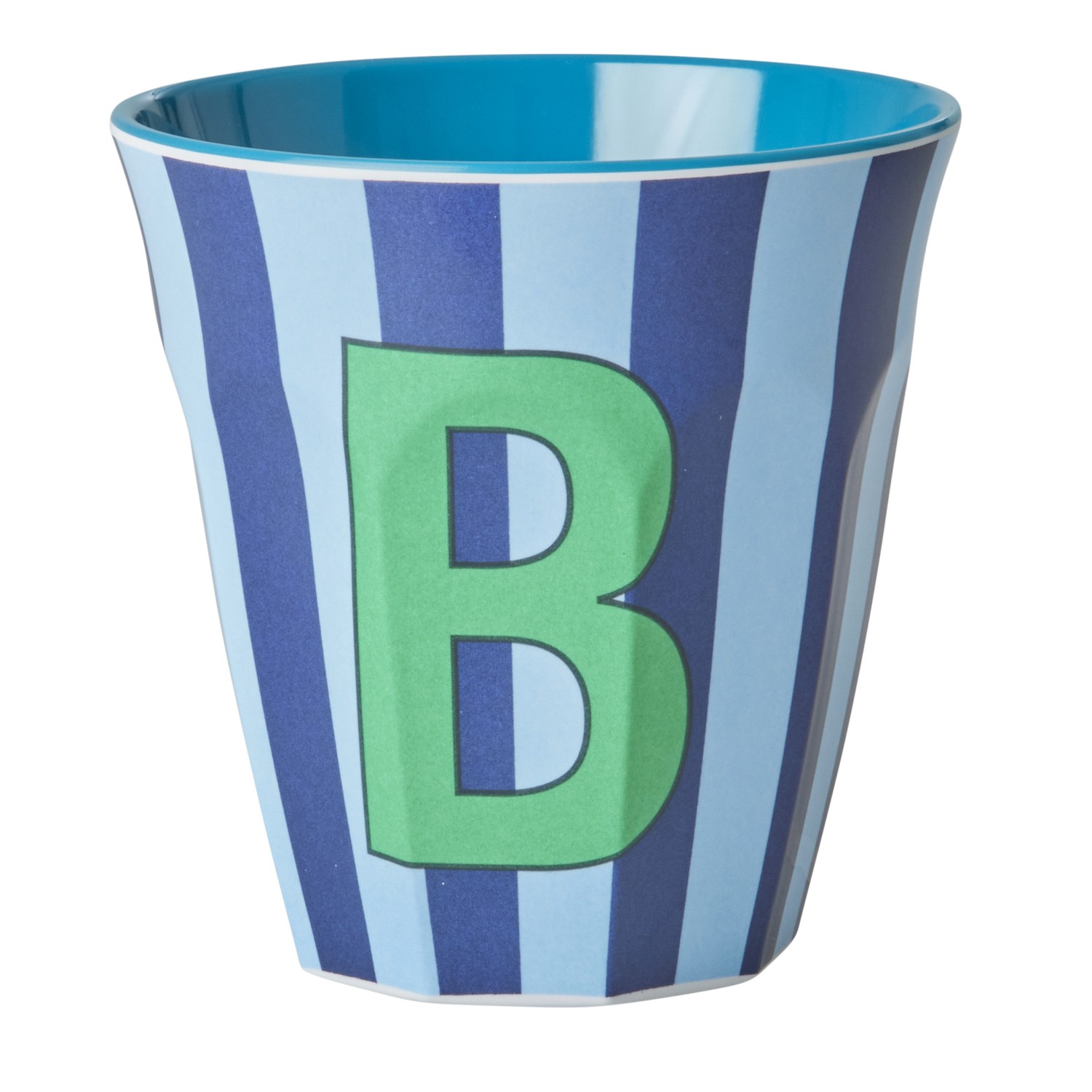 Bicchiere in melamina con interno in tinta unita turchese ed esterno con fantasia a righe sui toni del blu e dell’azzurro, decorata con la lettera “B” di colore verde. La decorazione della lettera e la combinazione di colore rendono il bicchiere un regalo davvero unico e personalizzato sia per i più grandi che per i più piccini. Ideale anche come porta matite o come vasetto per una piantina. Il prodotto non è adatto per l’utilizzo in microonde.