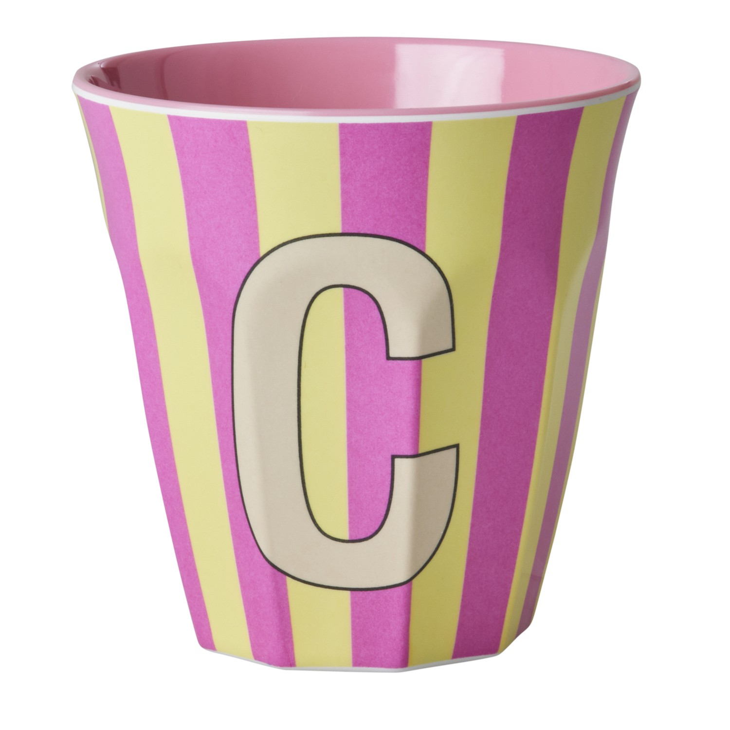 Bicchiere in melamina con interno in tinta unita rosa ed esterno con fantasia a righe sui toni del giallo e del fucsia, decorata con la lettera “C”. La decorazione della lettera e la combinazione di colore rendono il bicchiere un regalo davvero unico e personalizzato sia per i più grandi che per i più piccini. Ideale anche come porta matite o come vasetto per una piantina. Il prodotto non è adatto per l’utilizzo in microonde.