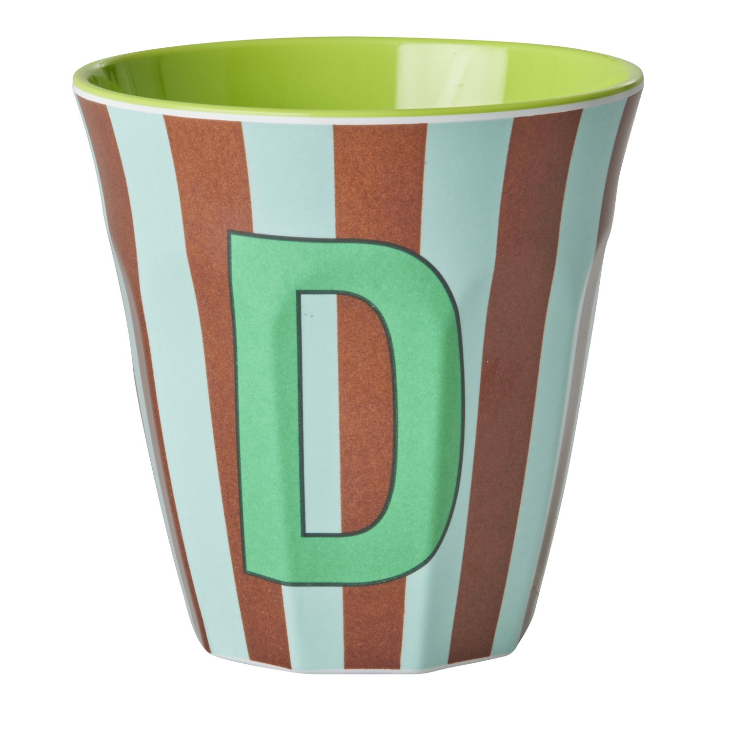 Bicchiere in melamina con interno in tinta unita verde ed esterno con fantasia a righe sui toni del marrone e dell’azzurro, decorata con la lettera “D” color verde acqua. La decorazione della lettera e la combinazione di colore rendono il bicchiere un regalo davvero unico e personalizzato sia per i più grandi che per i più piccini. Ideale anche come porta matite o come vasetto per una piantina. Il prodotto non è adatto per l’utilizzo in microonde.