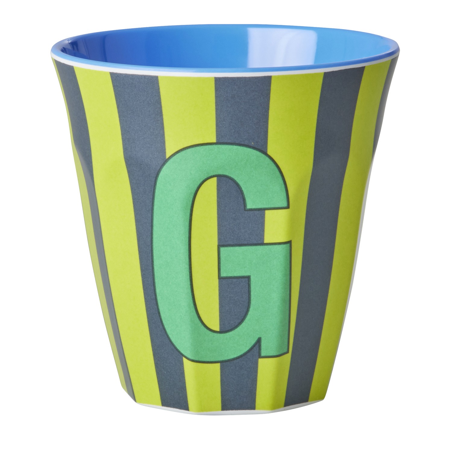Bicchiere in melamina con interno in tinta unita azzurra ed esterno con fantasia a righe sui toni del grigio e del verde, decorata con la lettera “G”. La decorazione della lettera e la combinazione di colore rendono il bicchiere un regalo davvero unico e personalizzato sia per i più grandi che per i più piccini. Ideale anche come porta matite o come vasetto per una piantina. Il prodotto non è adatto per l’utilizzo in microonde.
