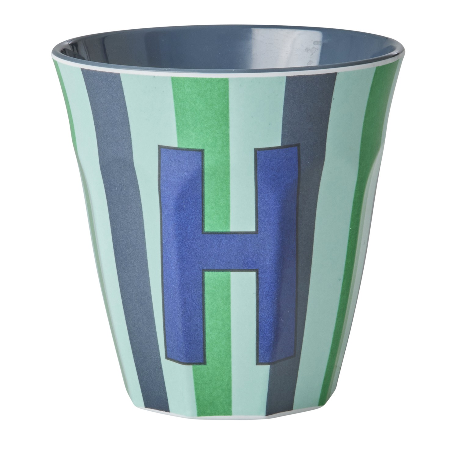 Bicchiere in melamina con interno in tinta unita grigia ed esterno con fantasia a righe sui toni del verde, decorata con la lettera “H” di colore blu. La decorazione della lettera e la combinazione di colore rendono il bicchiere un regalo davvero unico e personalizzato sia per i più grandi che per i più piccini. Ideale anche come porta matite o come vasetto per una piantina. Il prodotto non è adatto per l’utilizzo in microonde.