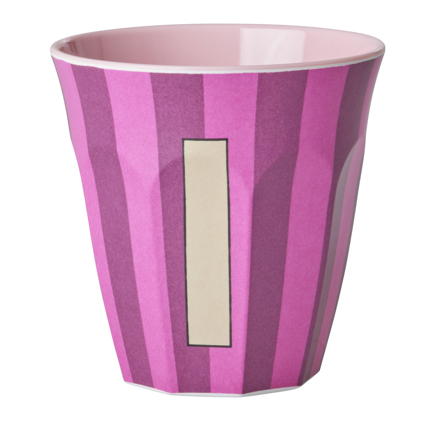 Bicchiere in melamina con interno in tinta unita rosa ed esterno con fantasia a righe sui toni del fucsia, decorata con la lettera “I”. La decorazione della lettera e la combinazione di colore rendono il bicchiere un regalo davvero unico e personalizzato sia per i più grandi che per i più piccini. Ideale anche come porta matite o come vasetto per una piantina. Il prodotto non è adatto per l’utilizzo in microonde.