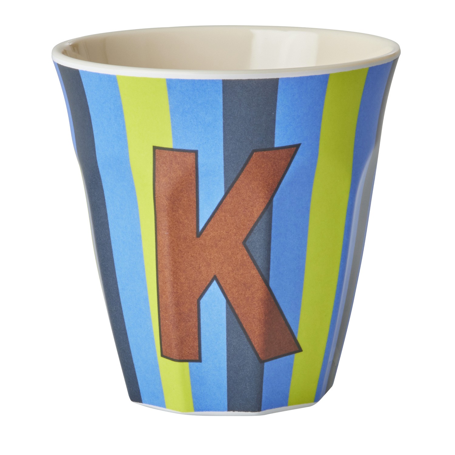Bicchiere in melamina con interno in tinta unita color panna ed esterno con fantasia a righe sui toni del giallo e dell’azzurro, decorata con la lettera “K” marrone. La decorazione della lettera e la combinazione di colore rendono il bicchiere un regalo davvero unico e personalizzato sia per i più grandi che per i più piccini. Ideale anche come porta matite o come vasetto per una piantina. Il prodotto non è adatto per l’utilizzo in microonde.