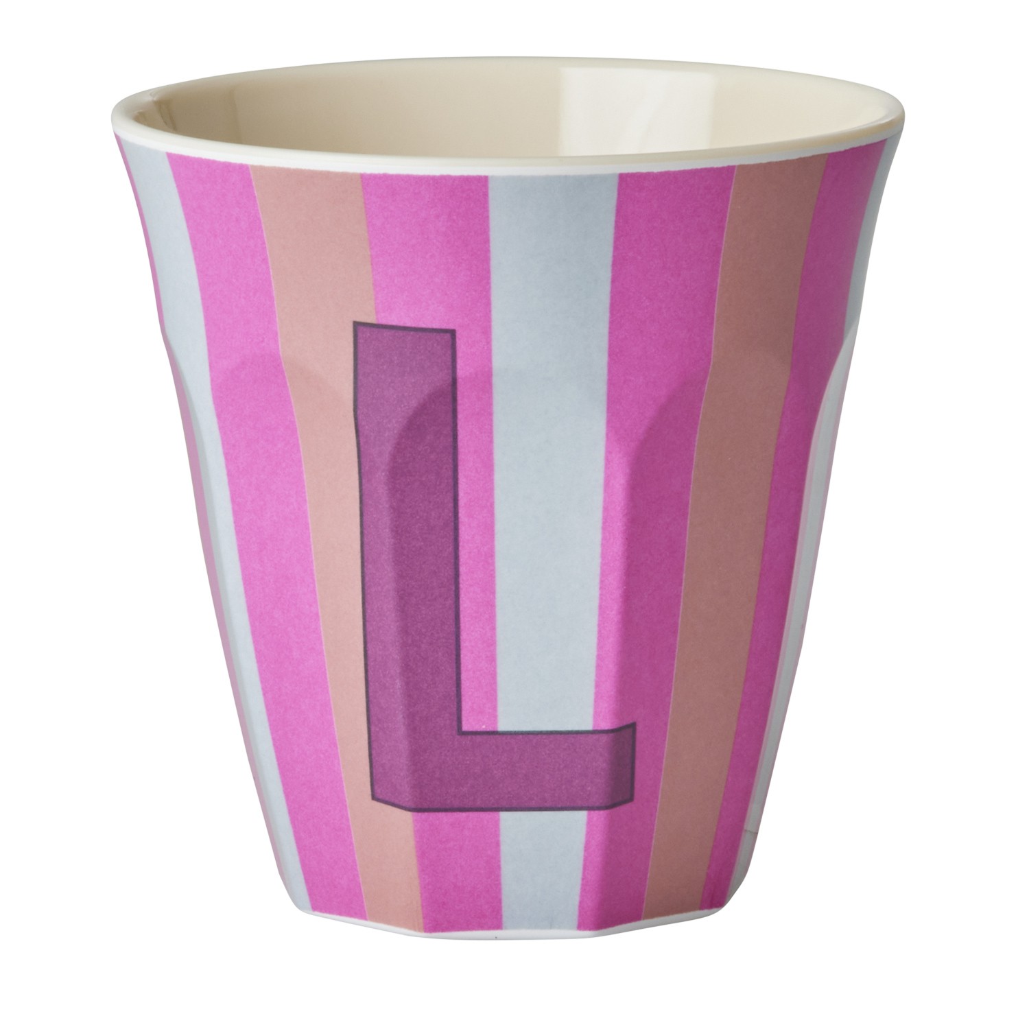 Bicchiere in melamina con interno in tinta unita color panna ed esterno con fantasia a righe sui toni del rosa e dell’azzurro, decorata con la lettera “L” bordeaux. La decorazione della lettera e la combinazione di colore rendono il bicchiere un regalo davvero unico e personalizzato sia per i più grandi che per i più piccini. Ideale anche come porta matite o come vasetto per una piantina. Il prodotto non è adatto per l’utilizzo in microonde.