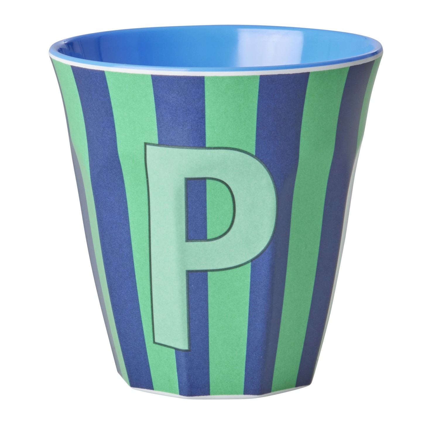Bicchiere in melamina con interno in tinta unita azzurra ed esterno con fantasia a righe verdi e blu, decorata con la lettera “P”. La decorazione della lettera e la combinazione di colore rendono il bicchiere un regalo davvero unico e personalizzato sia per i più grandi che per i più piccini. Ideale anche come porta matite o come vasetto per una piantina. Il prodotto non è adatto per l’utilizzo in microonde.