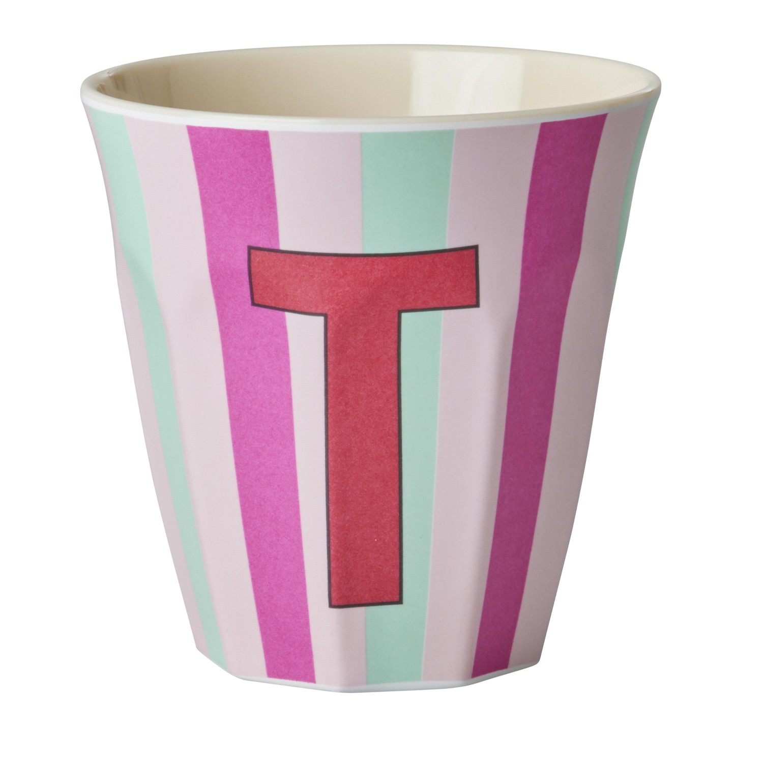 Bicchiere in melamina con interno in tinta unita color panna ed esterno con fantasia a righe sui toni del rosa e del verde, decorata con la lettera “T” color magenta. La decorazione della lettera e la combinazione di colore rendono il bicchiere un regalo davvero unico e personalizzato sia per i più grandi che per i più piccini. Ideale anche come porta matite o come vasetto per una piantina. Il prodotto non è adatto per l’utilizzo in microonde.