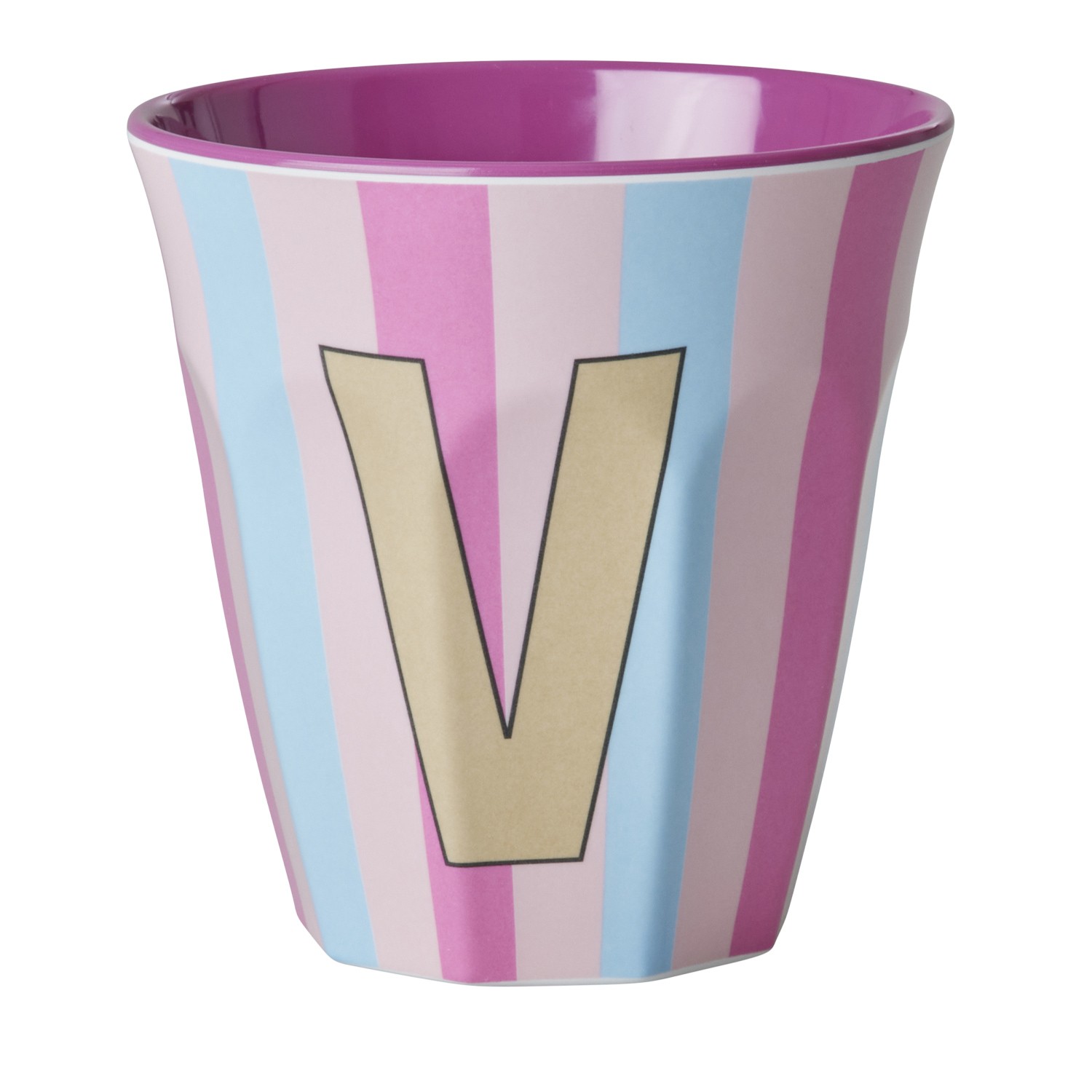 Bicchiere in melamina con interno in tinta unita viola prugna ed esterno con fantasia a righe sui toni del rosa e dell’azzurro, decorata con la lettera “V”. La decorazione della lettera e la combinazione di colore rendono il bicchiere un regalo davvero unico e personalizzato sia per i più grandi che per i più piccini. Ideale anche come porta matite o come vasetto per una piantina. Il prodotto non è adatto per l’utilizzo in microonde.