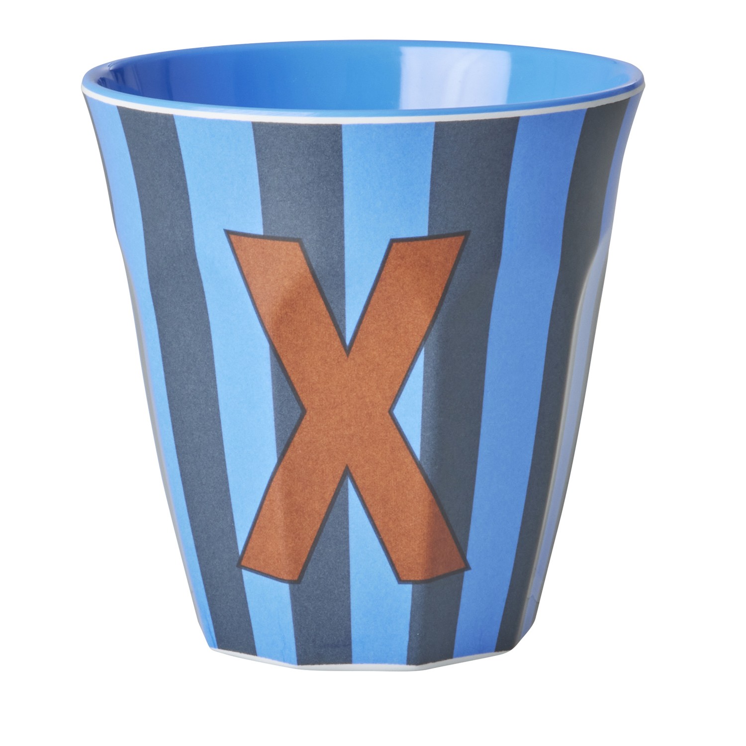 Bicchiere in melamina con interno in tinta unita azzurra ed esterno con fantasia a righe azzurre e grigie, decorata con la lettera “X” marrone. La decorazione della lettera e la combinazione di colore rendono il bicchiere un regalo davvero unico e personalizzato sia per i più grandi che per i più piccini. Ideale anche come porta matite o come vasetto per una piantina. Il prodotto non è adatto per l’utilizzo in microonde.
