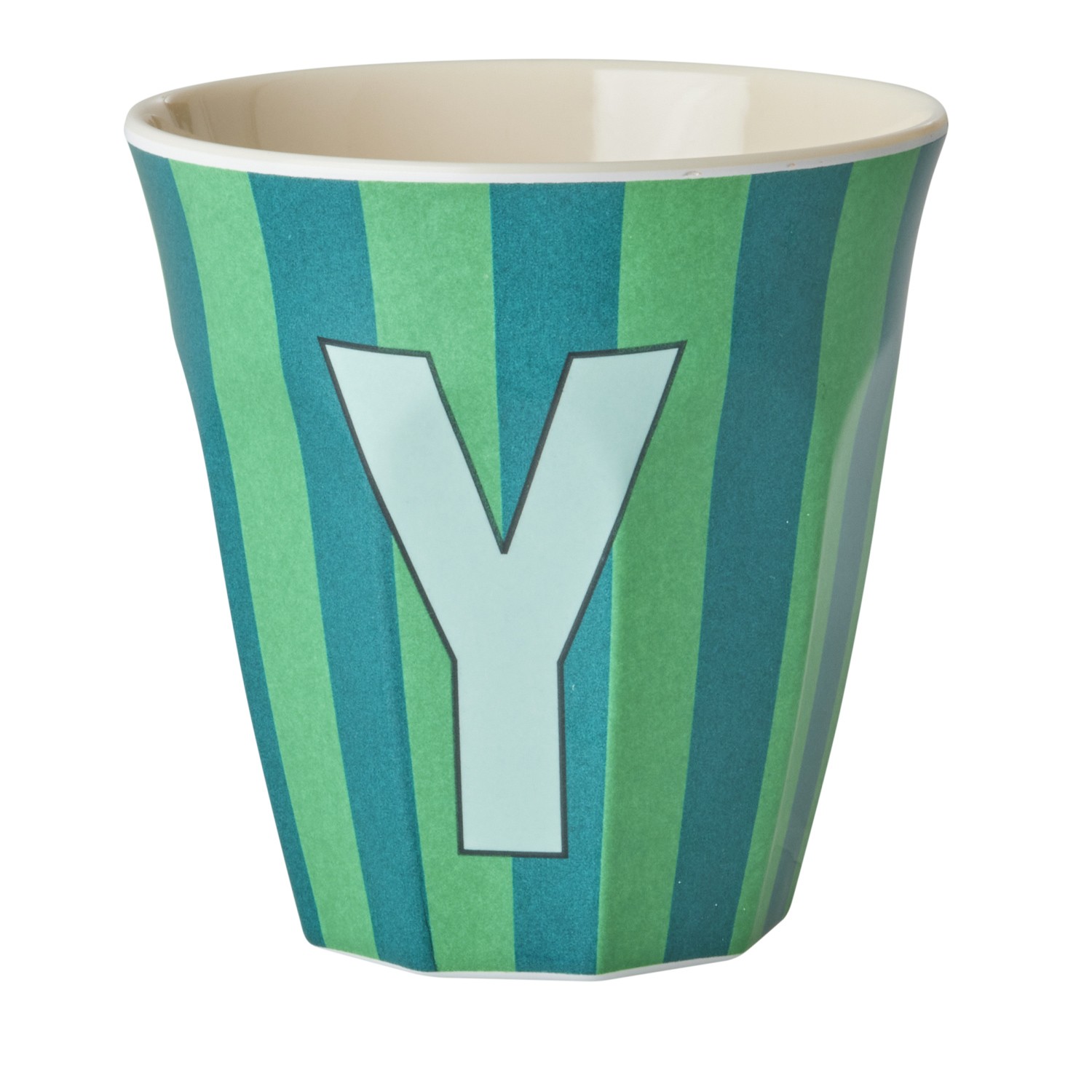 Bicchiere in melamina con interno in tinta unita color panna ed esterno con fantasia a righe sui toni del verde, decorata con la lettera “Y”. La decorazione della lettera e la combinazione di colore rendono il bicchiere un regalo davvero unico e personalizzato sia per i più grandi che per i più piccini. Ideale anche come porta matite o come vasetto per una piantina. Il prodotto non è adatto per l’utilizzo in microonde.