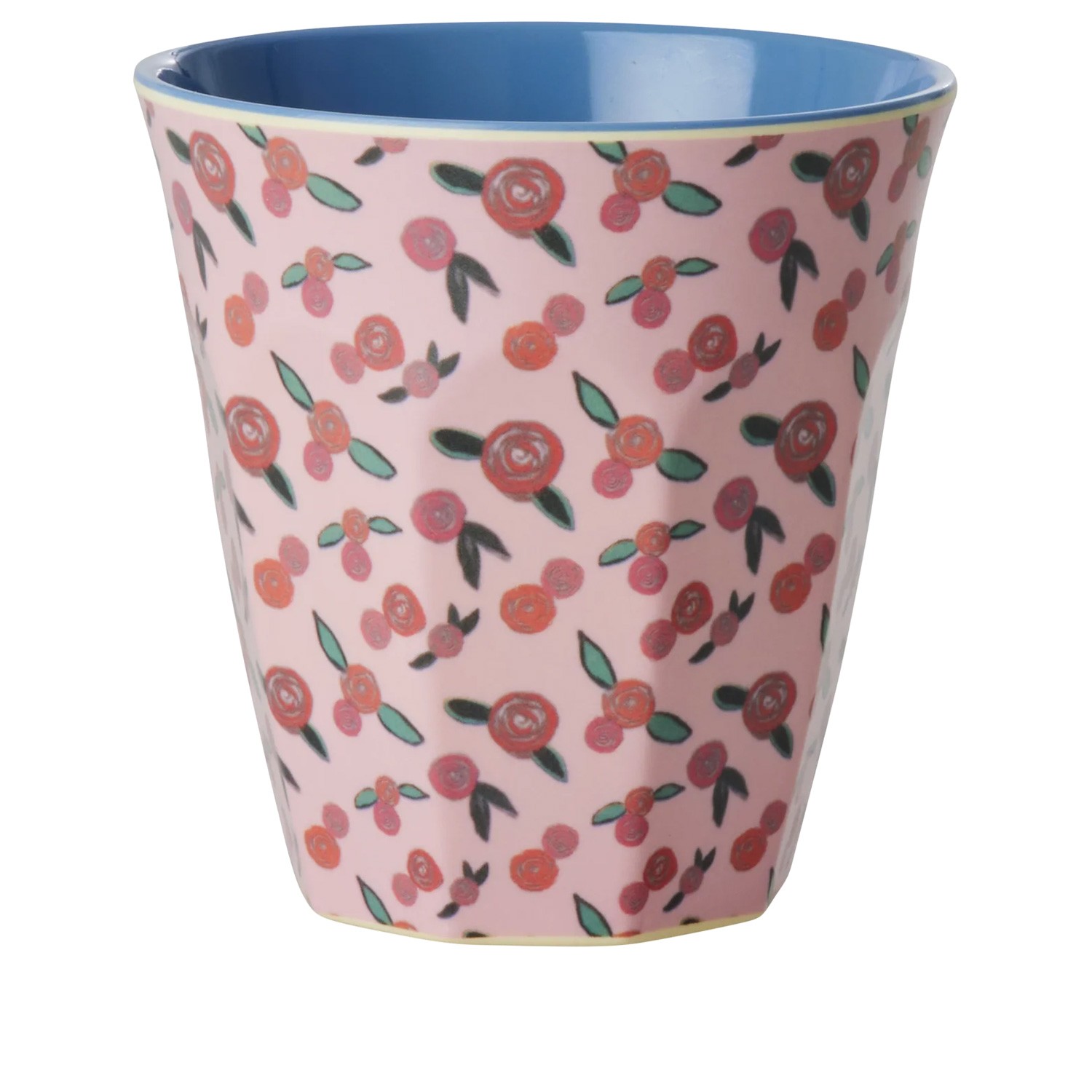Bicchiere medio con graziosa fantasia di roselline su sfondo rosa all'esterno ed interno in tinta unita azzurra. Realizzato in melamina resistente, questo bicchiere è robusto e durevole, perfetto per un uso quotidiano. La sua forma ergonomica lo rende comodo da impugnare, anche per i più piccoli, mentre la sua capacità (250ml) lo rende ideale per acqua, succhi di frutta, tè e altre bevande fredde. Non adatto al microonde. Disponibile in altre fantasie.