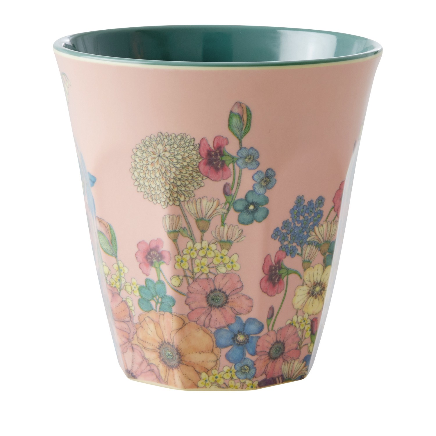 Bicchiere medio realizzato in melamina con deliziosa fantasia floreale su sfondo rosa all'esterno e tinta unita verde smeraldo all'interno. Perfetto per aggiungere un tocco di divertimento ai pasti, per una cioccolata calda o per contenere matite e piantine. Perfetto da abbinare alle tazze e ai piatti a tema. Non adatto per l'uso nel microonde.
