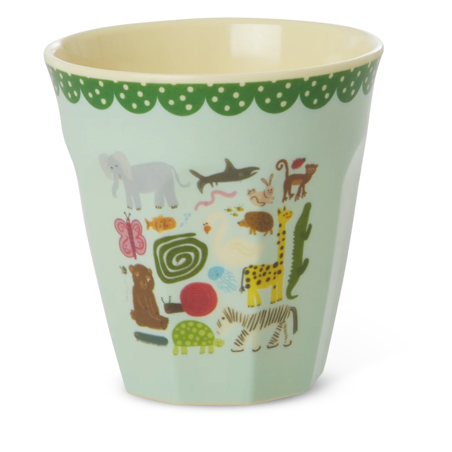 Bicchiere medio realizzato in melamina con simpatica fantasia a tema Wildlife su sfondo verde menta all'esterno e tinta unita color crema all'interno. Perfetto per aggiungere un tocco di divertimento ai pasti dei più piccoli, per una cioccolata calda o per contenere matite e piantine.