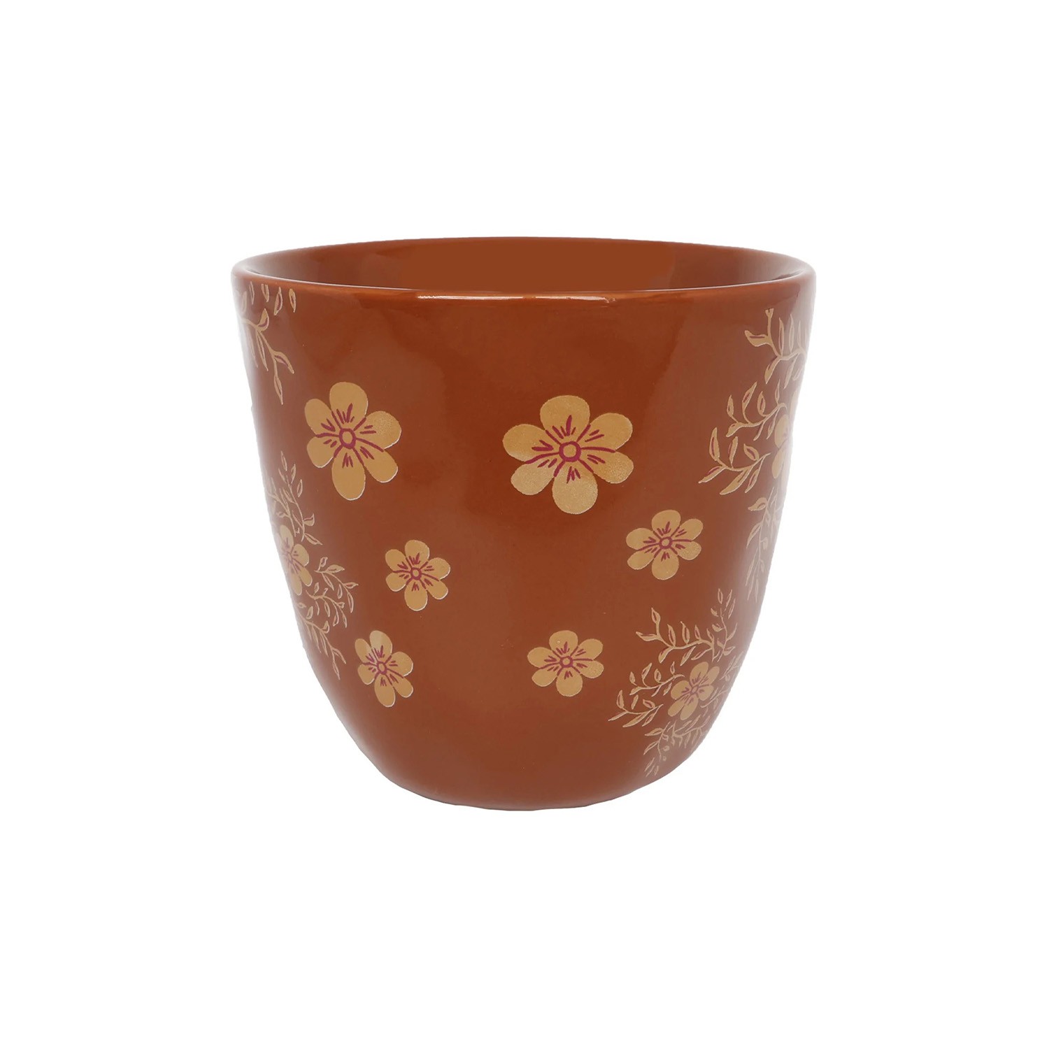 Bicchiere in ceramica color ocra con lettera dell'alfabeto H disegnata assieme ad una fantasia di foglie e fiori.