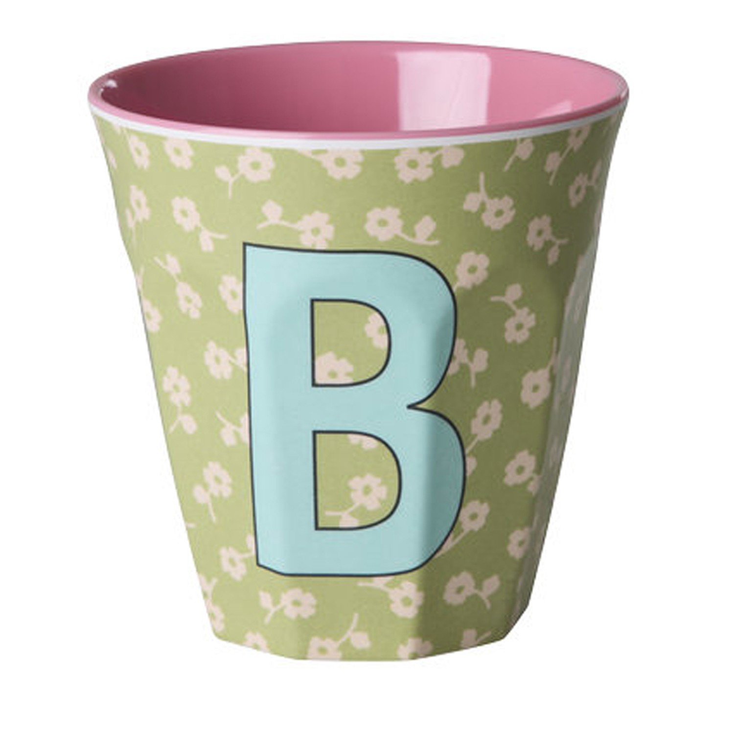 Bicchiere in melamina con interno in tinta unita rosa ed esterno con fantasia floreale su sfondo verde, decorato con la lettera “B” di colore celeste. La decorazione della lettera e la combinazione di colore rendono il bicchiere un regalo davvero unico e personalizzato sia per i più grandi che per i più piccini. Ideale anche come porta matite o come vasetto per una piantina. Il prodotto non è adatto per l’utilizzo in microonde.