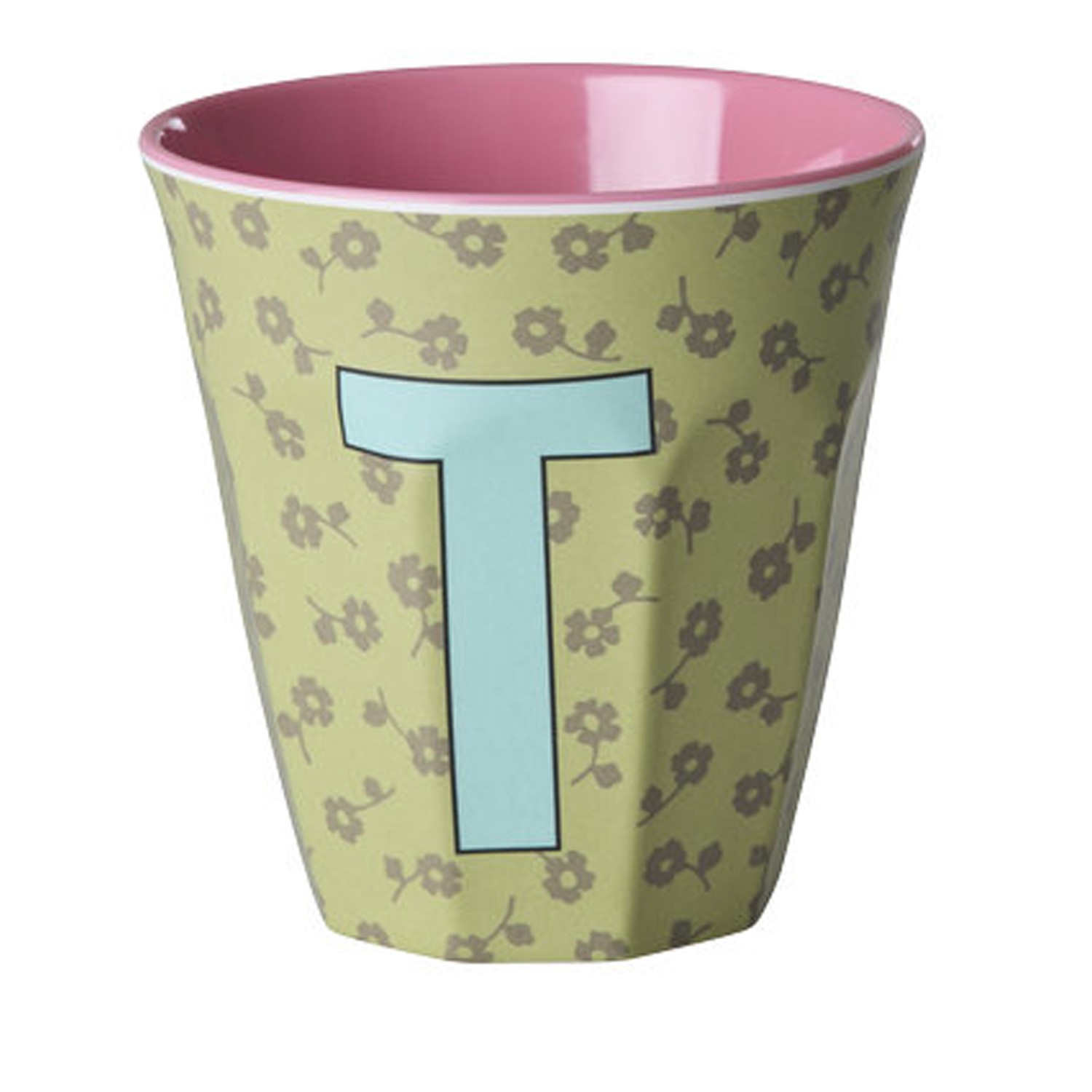 Bicchiere in melamina con interno in tinta unita rosa ed esterno con fantasia floreale su sfondo verde pastello, decorato con la lettera “T” color celeste. La decorazione della lettera e la combinazione di colore rendono il bicchiere un regalo davvero unico e personalizzato sia per i più grandi che per i più piccini. Ideale anche come porta matite o come vasetto per una piantina. Il prodotto non è adatto per l’utilizzo in microonde.
