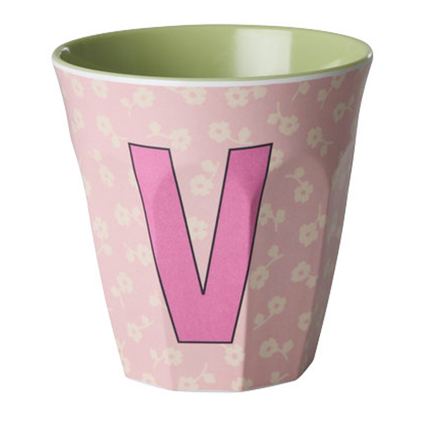 Bicchiere in melamina con interno in tinta unita verde pastello ed esterno con fantasia floreale su sfondo rosa chiaro, decorato con la lettera “V” di colore fucsia. La decorazione della lettera e la combinazione di colore rendono il bicchiere un regalo davvero unico e personalizzato sia per i più grandi che per i più piccini. Ideale anche come porta matite o come vasetto per una piantina. Il prodotto non è adatto per l’utilizzo in microonde.