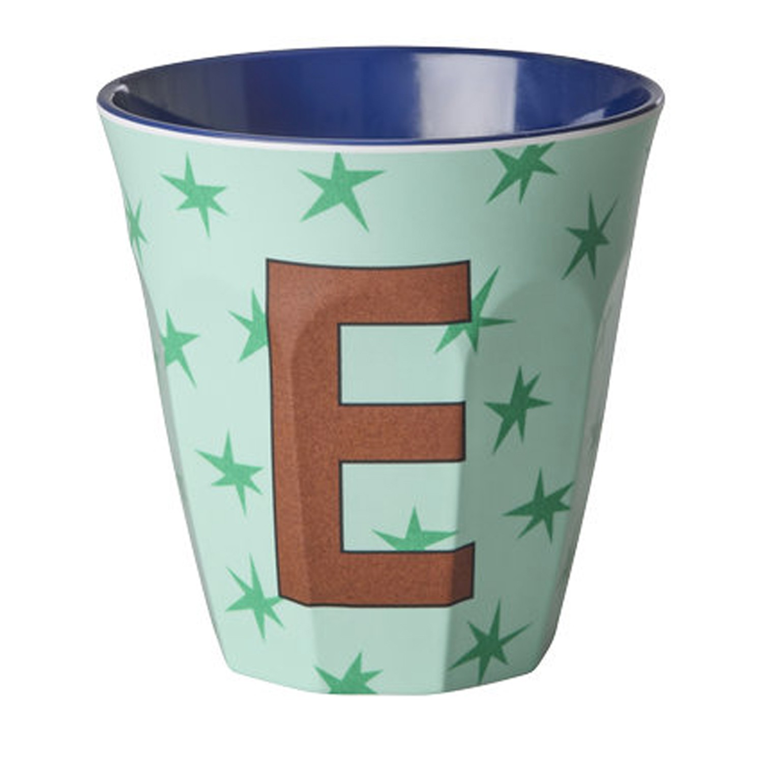 Bicchiere in melamina con interno in tinta unita blu ed esterno con fantasia stellata su sfondo verde acqua, decorato con la lettera “E”. La decorazione della lettera e la combinazione di colore rendono il bicchiere un regalo davvero unico e personalizzato sia per i più grandi che per i più piccini. Ideale anche come porta matite o come vasetto per una piantina. Il prodotto non è adatto per l’utilizzo in microonde.