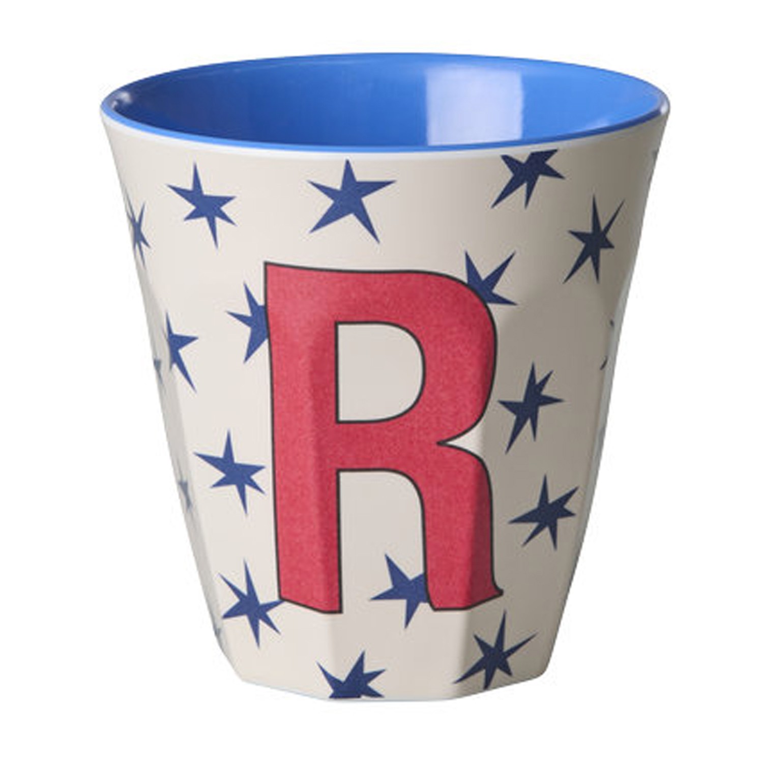 Bicchiere in melamina con interno in tinta unita azzurra ed esterno con fantasia stellata su sfondo color panna, decorato con la lettera “R” color corallo scuro. La decorazione della lettera e la combinazione di colore rendono il bicchiere un regalo davvero unico e personalizzato sia per i più grandi che per i più piccini. Ideale anche come porta matite o come vasetto per una piantina. Il prodotto non è adatto per l’utilizzo in microonde.