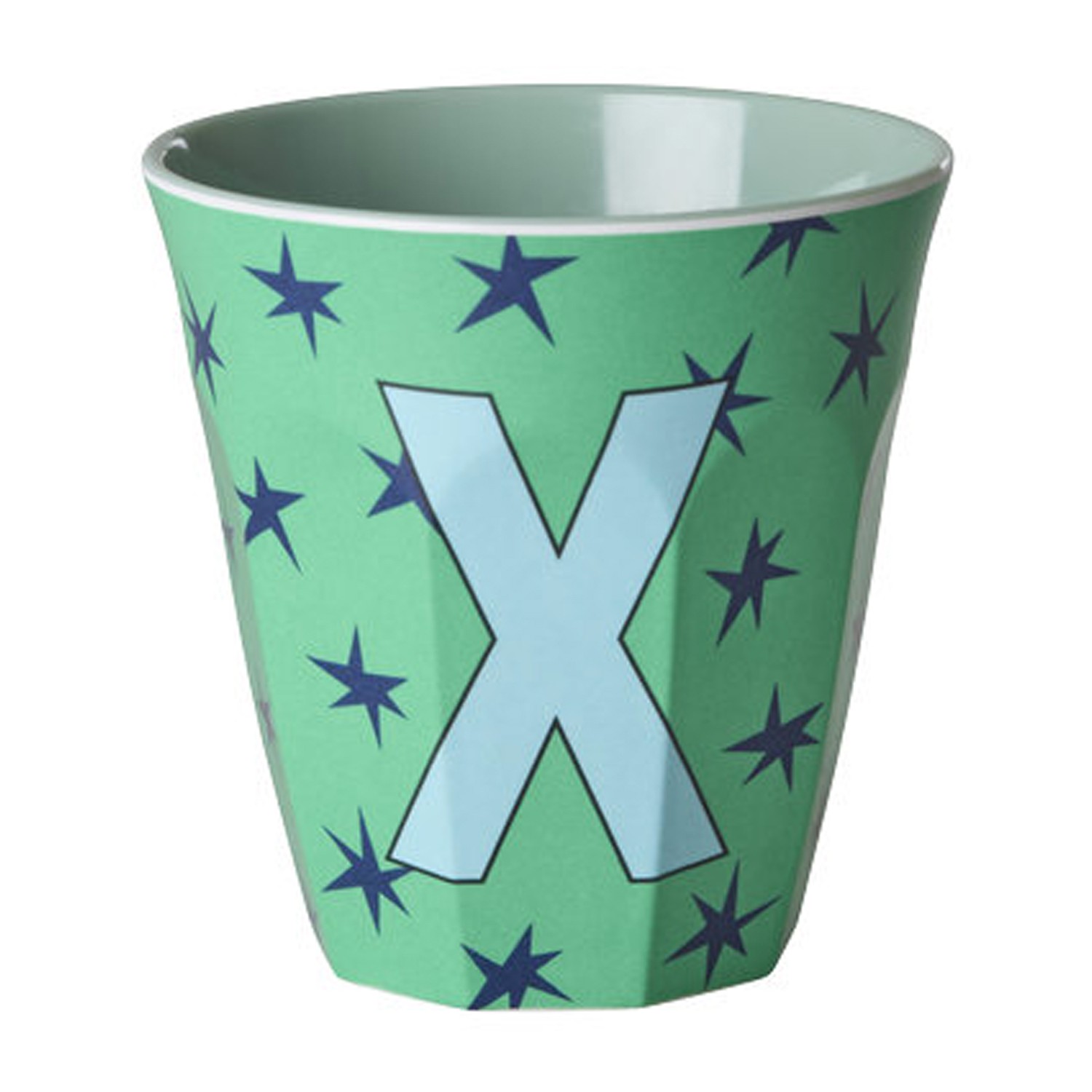 Bicchiere in melamina con interno in tinta unita verde salvia ed esterno con fantasia stellata su sfondo verde menta, decorato con la lettera “X” di colore celeste. La decorazione della lettera e la combinazione di colore rendono il bicchiere un regalo davvero unico e personalizzato sia per i più grandi che per i più piccini. Ideale anche come porta matite o come vasetto per una piantina. Il prodotto non è adatto per l’utilizzo in microonde.