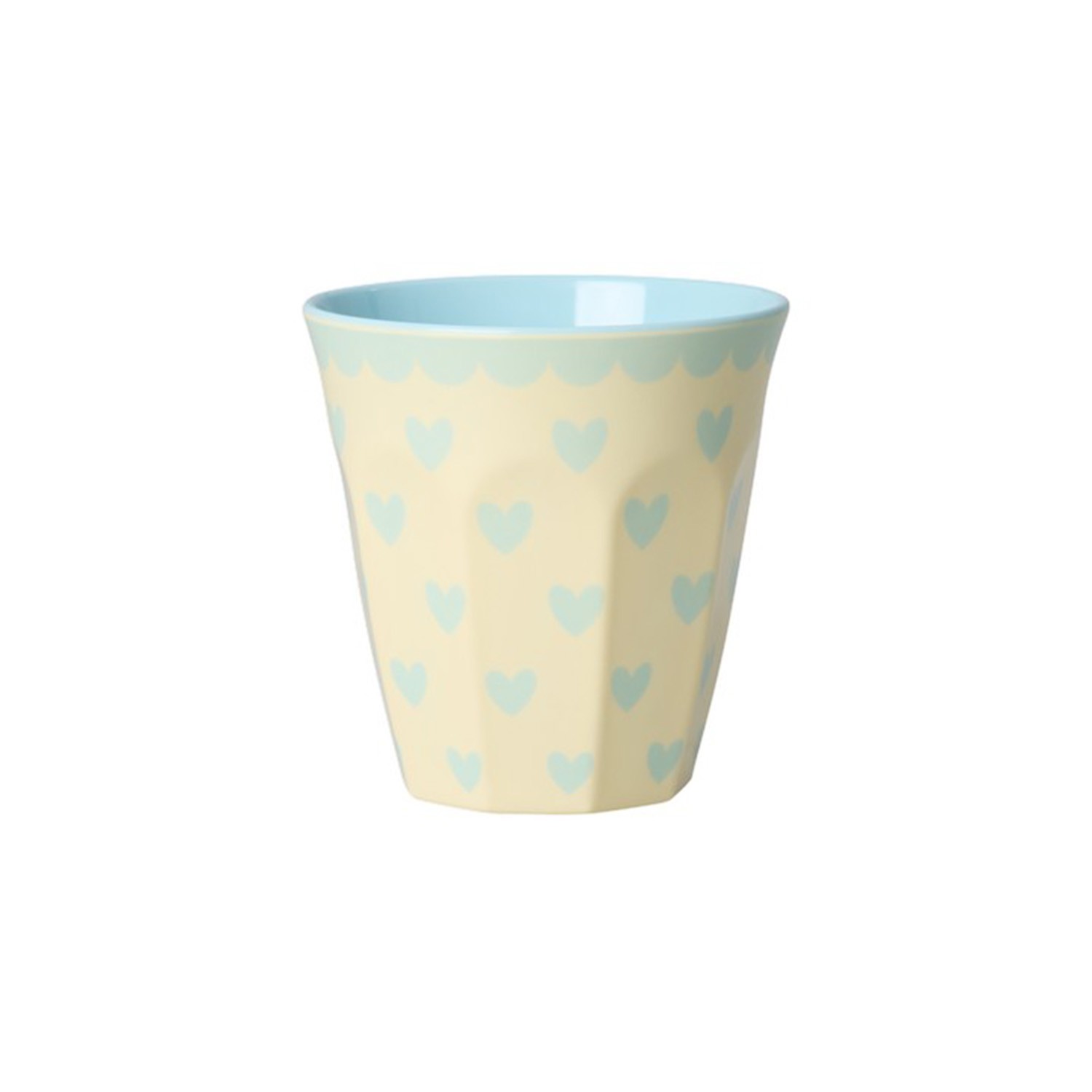 Bicchiere medio realizzato in melamina color crema con fantasia di cuoricini celesti disegnata all'esterno e tinta unita celeste in pendant all'interno. Perfetto per aggiungere un tocco romantico alle colazioni, per una cioccolata calda o per contenere matite e piantine.