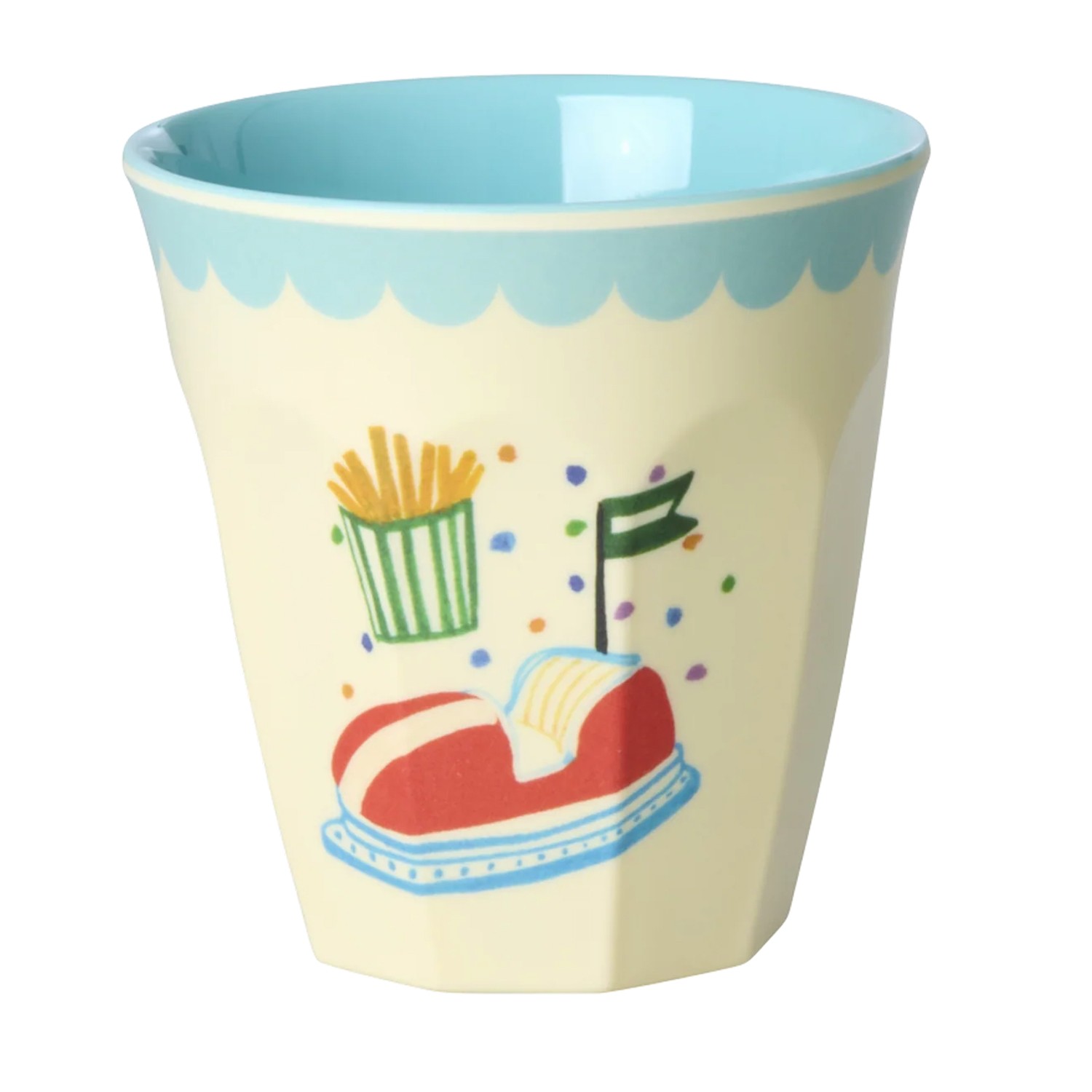 Bicchiere piccolo per bambini color crema dalla simpatica fantasia a tema parco divertimenti con autoscontri disegnata esternamente ed interno in tinta unita azzurro con fine bordo smerlato. Realizzato in melamina resistente, questo bicchiere è robusto e durevole, perfetto per un uso quotidiano.