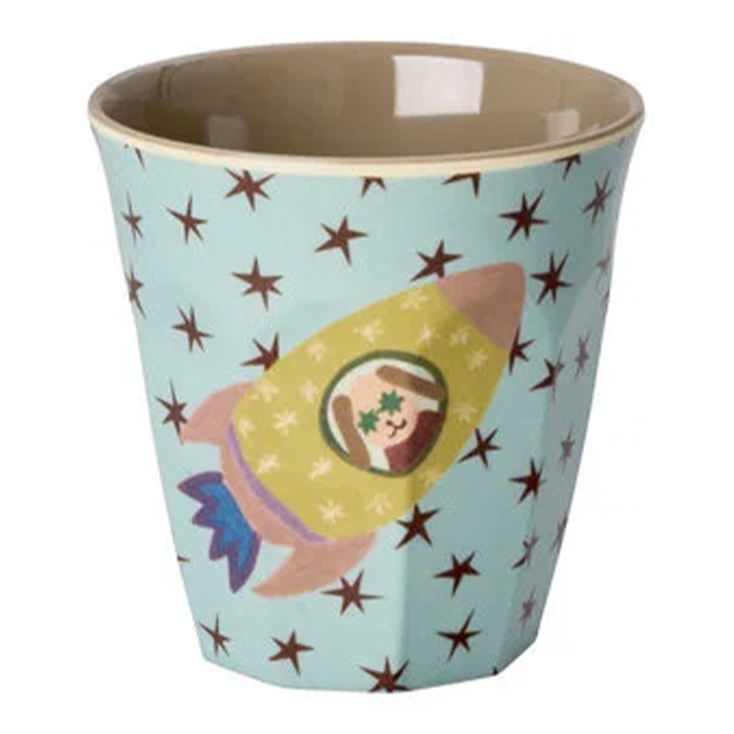 Bicchiere piccolo per bambini con esterno celeste abbellito da una simpatica stampa con cagnolino su razzo spaziale ed interno in tinta unita color tortora. Realizzato in melamina resistente, questo bicchiere è robusto e durevole, perfetto per un uso quotidiano. La sua forma ergonomica lo rende comodo da impugnare, anche per i più piccoli, mentre la sua capacità (160ml) lo rende ideale per acqua, succhi di frutta, tè e altre bevande fredde. Non adatto al microonde. Disponibile in altre fantasie.