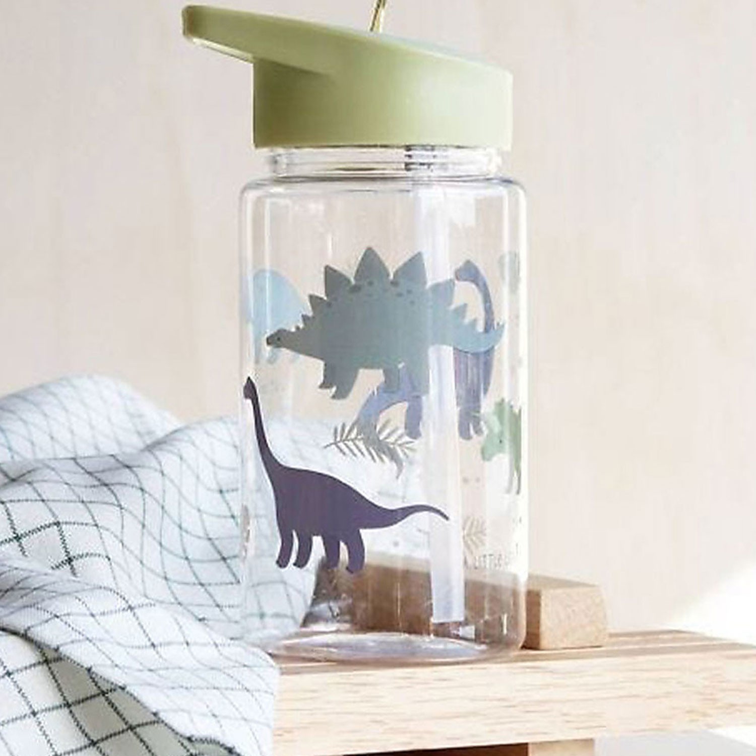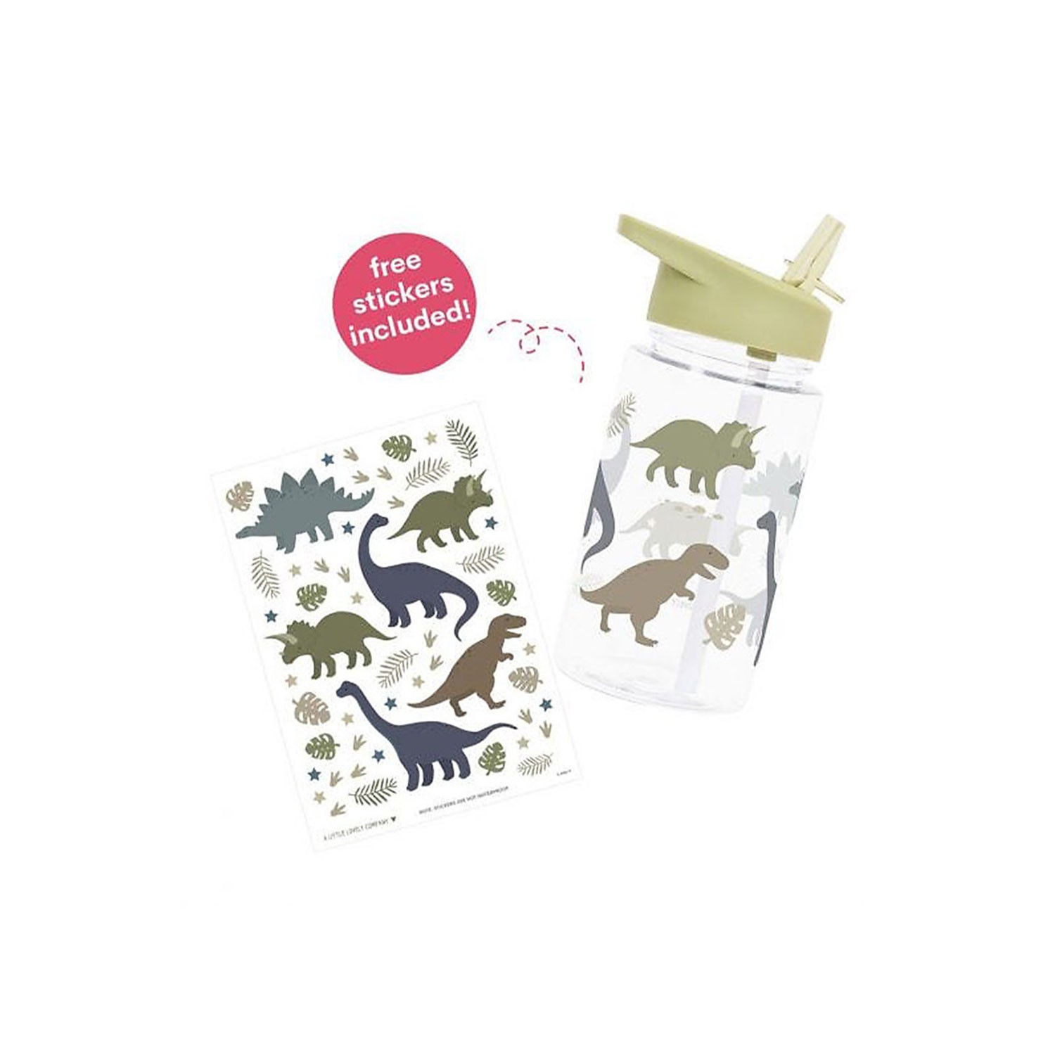 Borraccia di plastica trasparente per bimbo con dinosauri da attaccare come stickers adesivi a proprio piacimento, dotata di tappo verde oliva e pratica cannuccia apri-chiudi.