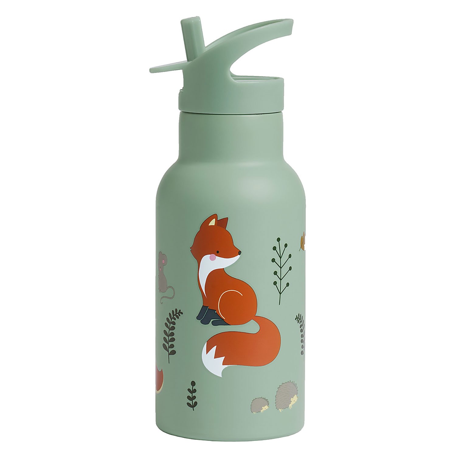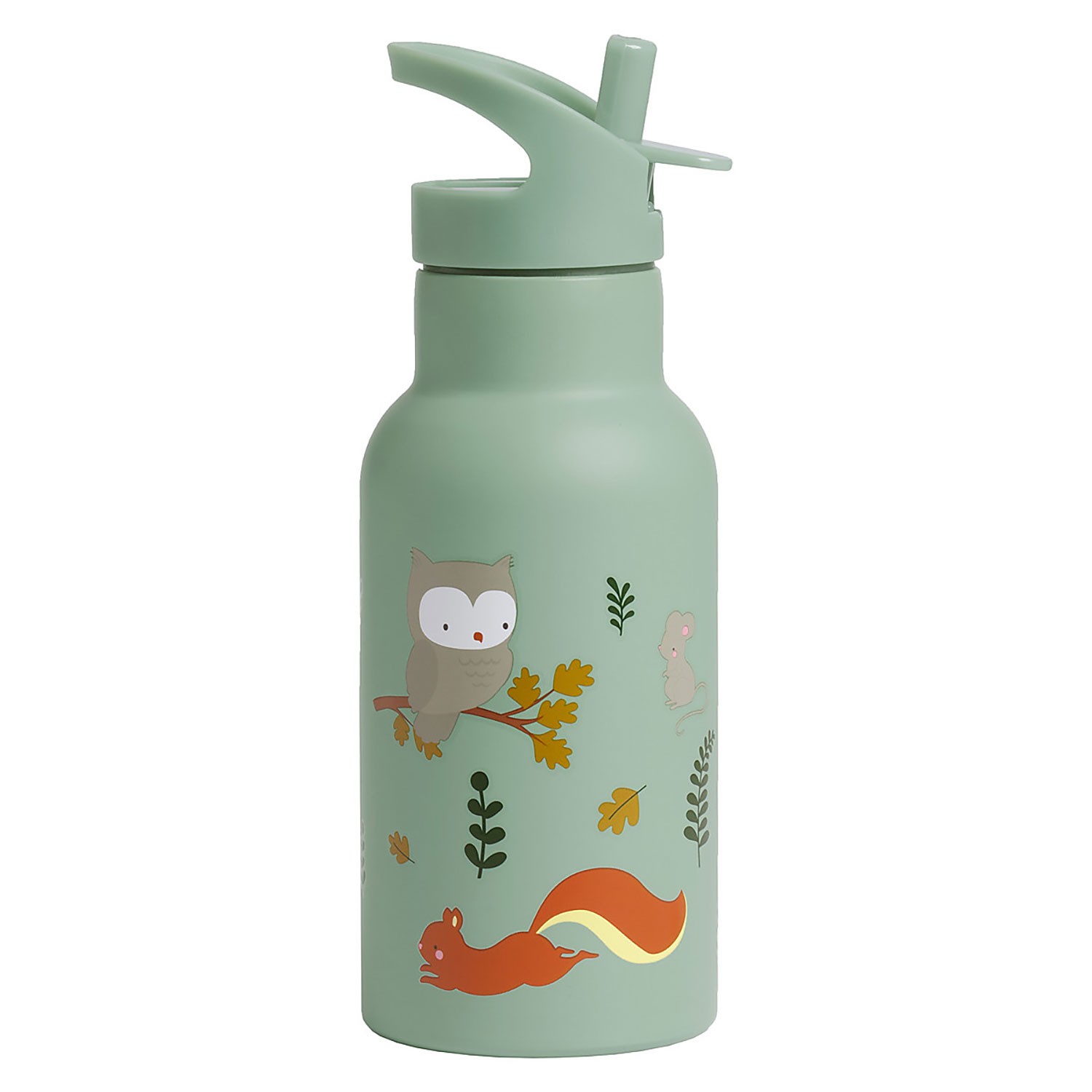 Borraccia in acciaio inox di colore verde acqua per bimbo con simpatica fantasia disegnata a tema amici della foresta, dotata di tappo e pratica cannuccia apri-chiudi.