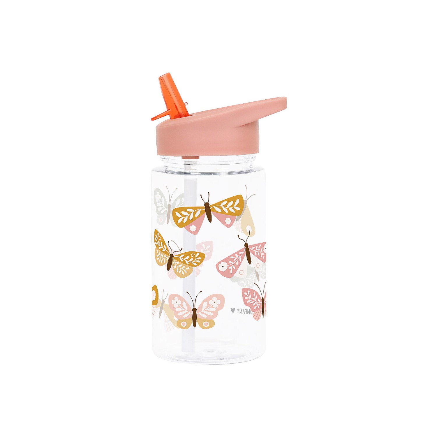 Borraccia di plastica trasparente per bimbo con graziosa fantasia con farfalle, dotata di tappo color rosa e pratica cannuccia apri-chiudi.